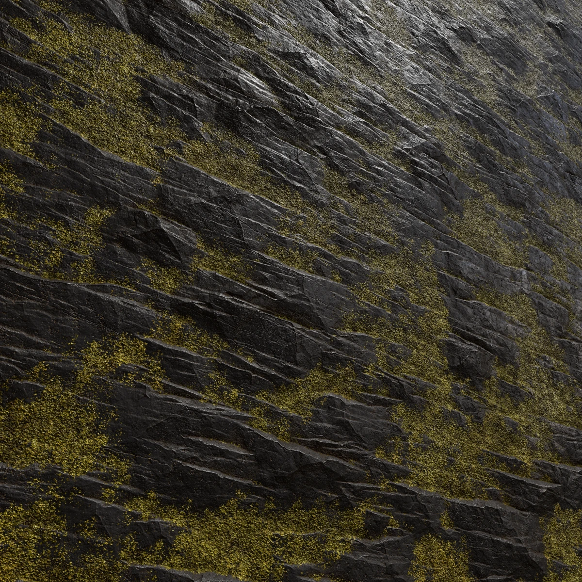 Black Rock Cliff With Moss PBR Texture with maps: basecolor/diffuse, glossiness, height (TIFF), IOR, metallic, normal (DirectX), normal (OpenGL), reflection, roughness and specular. Resolution: 8192x8192px and 4096x4096px.