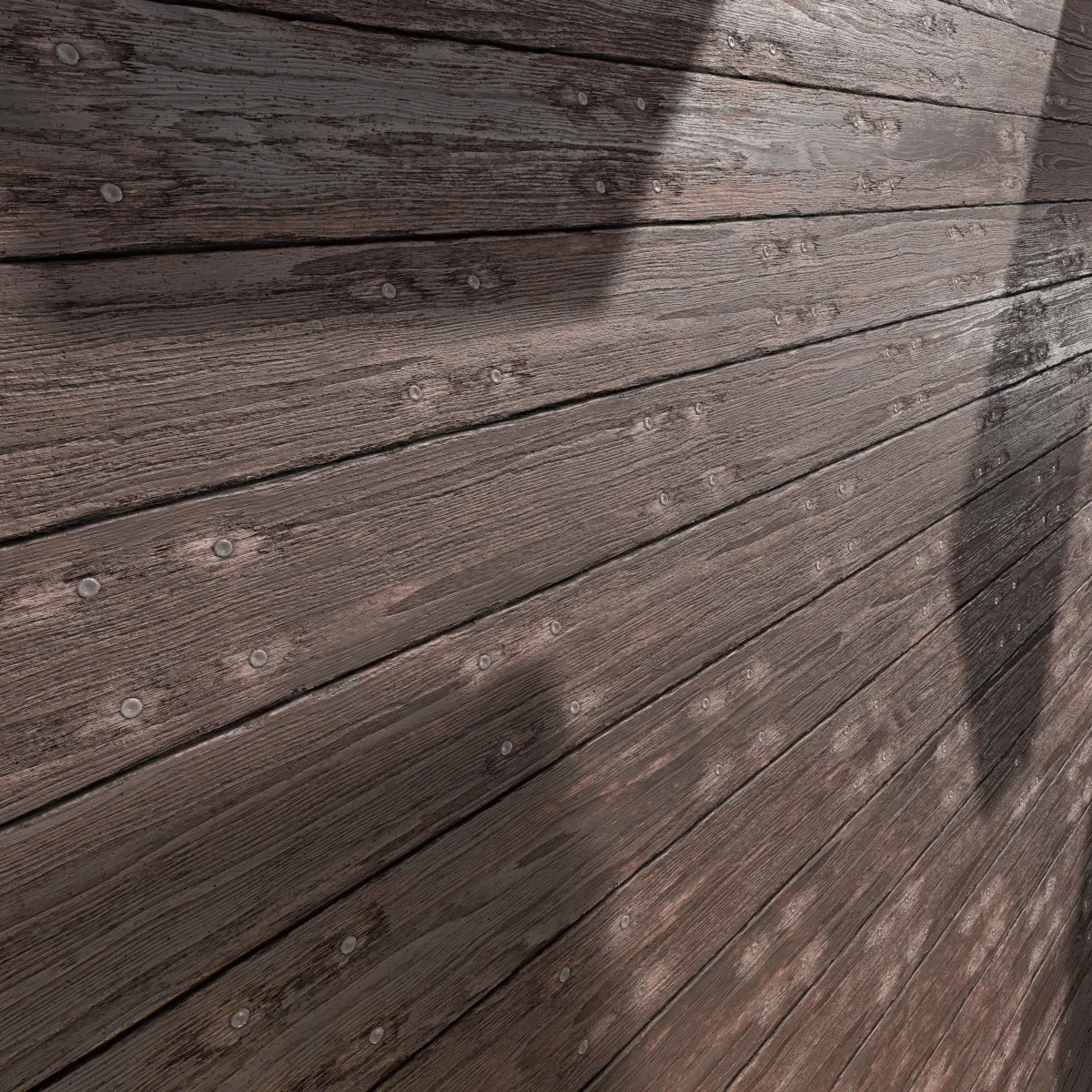 Brown Horizontal Planks With Nails PBR Texture with maps: albedo/diffuse, reflection, glossiness, height/displacement, roughness, metalness, opacity, ambient occlusion and normal map. Resolution: 8192x8192px and 4096x4096px.