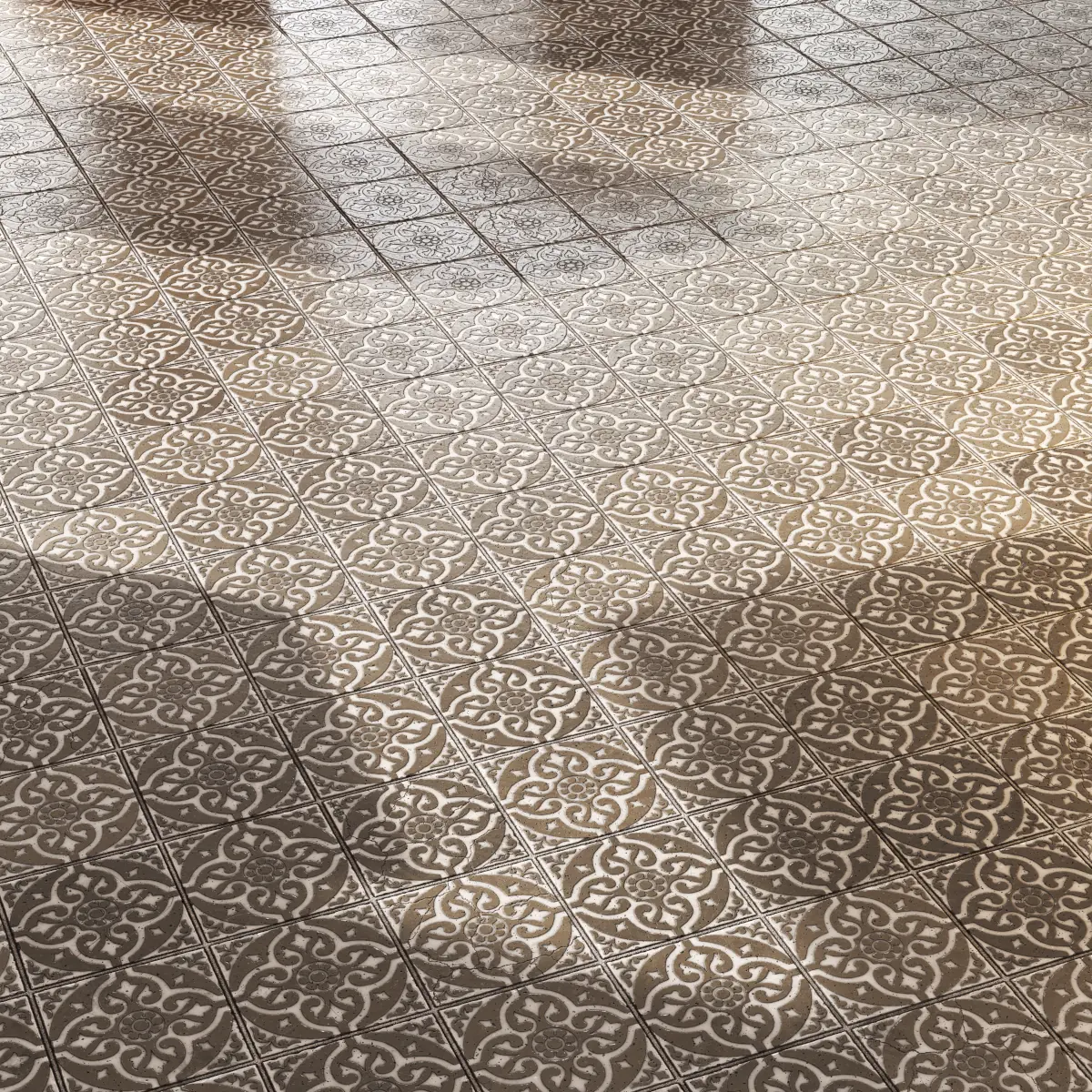 Brown Patterned Tiles PBR Texture with maps: albedo/diffuse, reflection, glossiness, height/displacement, roughness, metalness, opacity, ambient occlusion and normal map. Resolution: 8192x8192px and 4096x4096px.