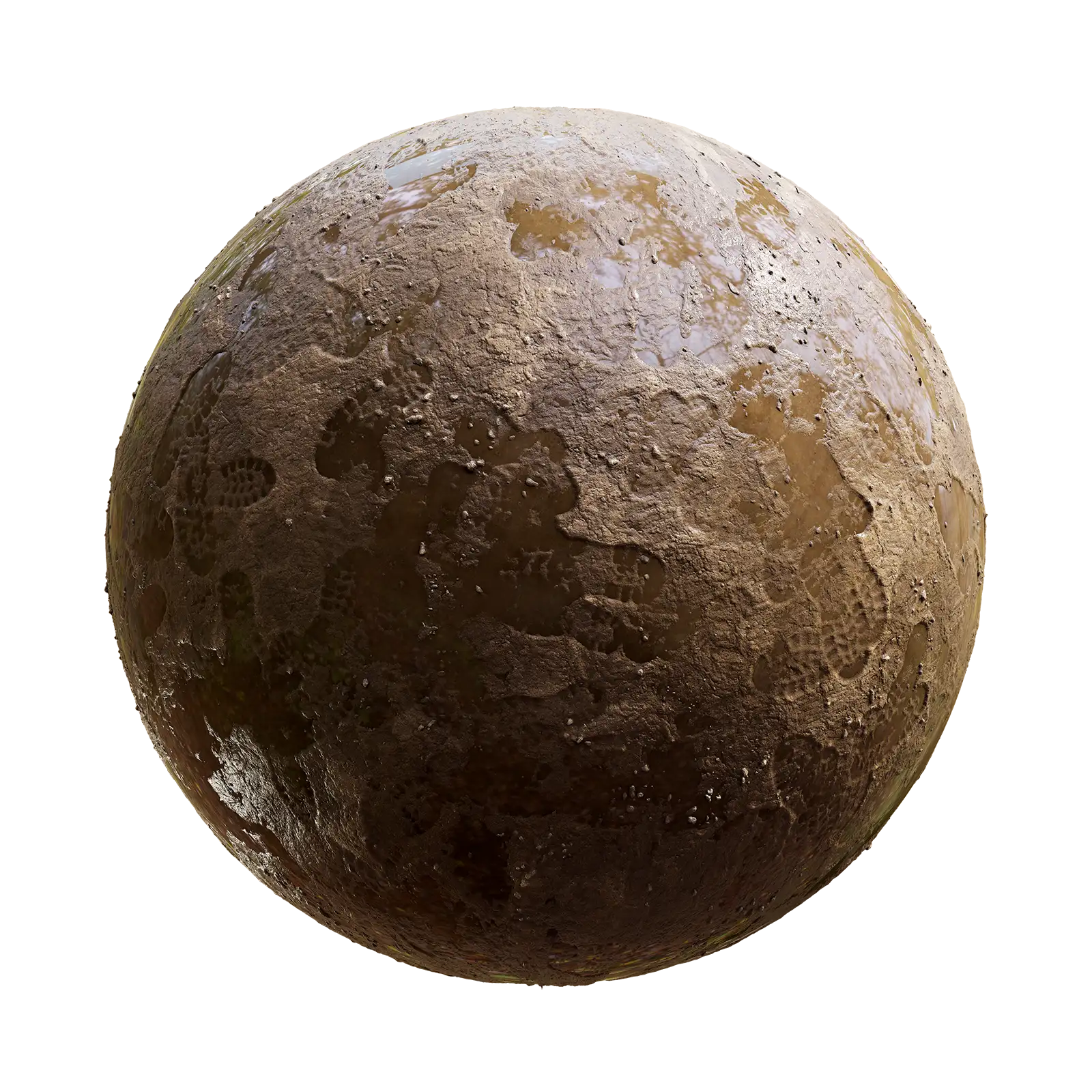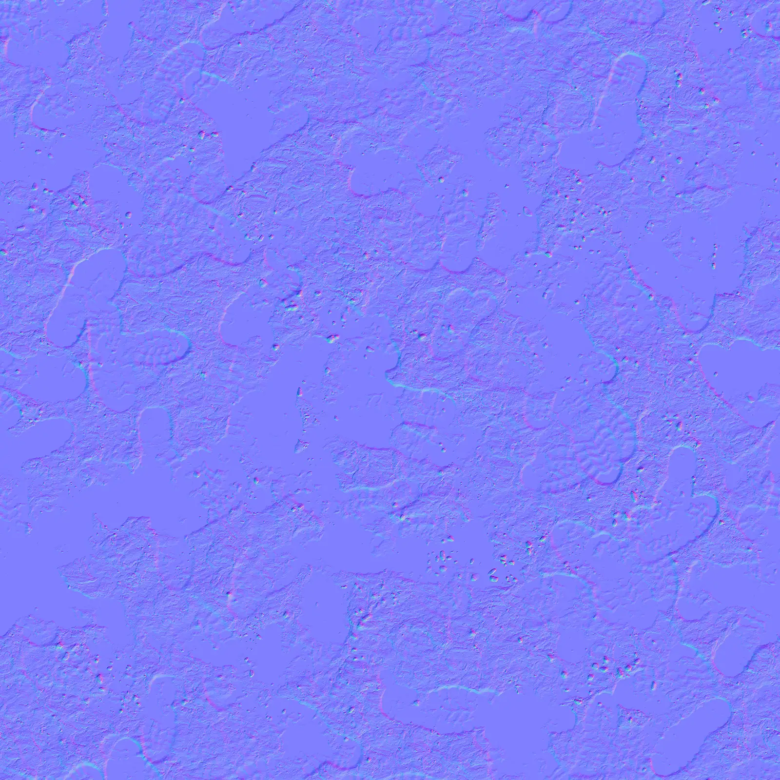 Brown Wet Mud Footprints with maps: basecolor/diffuse, glossiness, height (TIFF), IOR, metallic, normal (DirectX), normal (OpenGL), reflection, roughness and specular. Resolution: 8192x8192px and 4096x4096px.