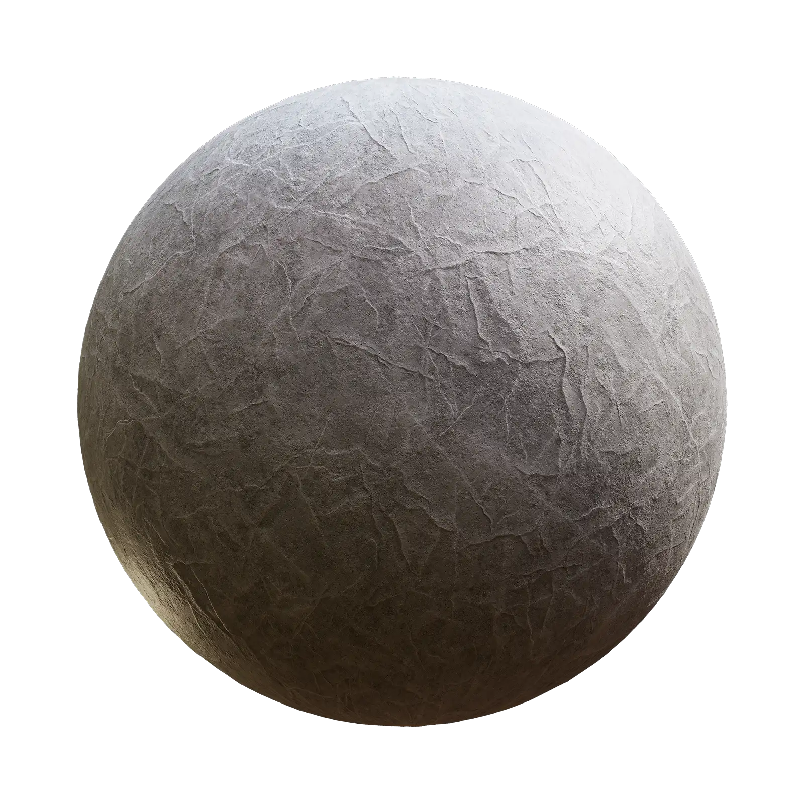 Grey concrete PBR texture featuring a weathered surface with visible cracks, rough texture, and natural wear patterns. Suitable for architectural visualization, building exteriors, industrial environments, and urban scene construction in 3D applications.