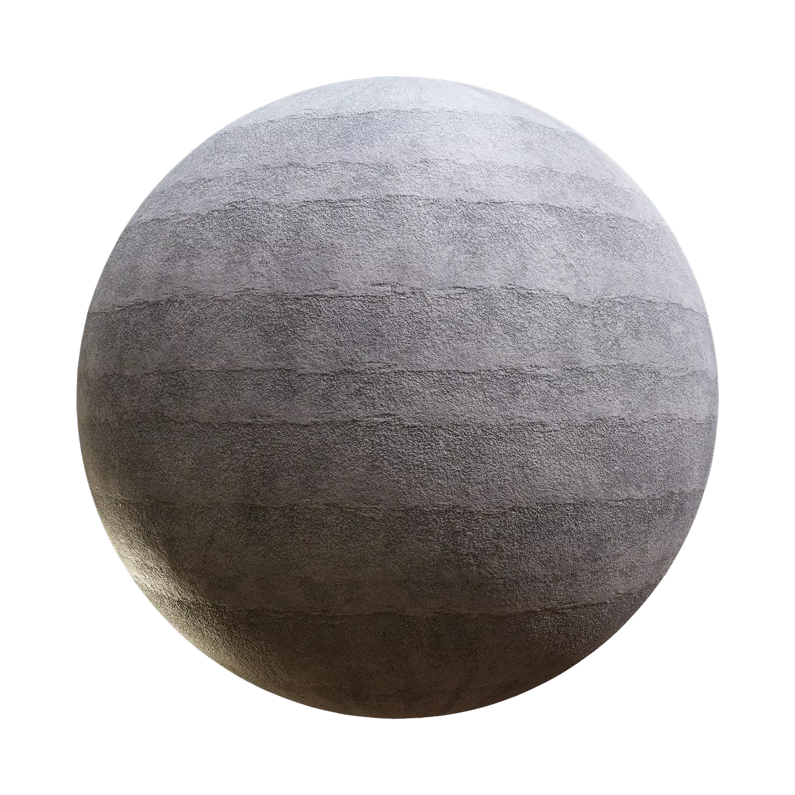 Layered concrete texture featuring horizontal bands in grey and brown tones with rough, weathered surface characteristics. Suitable for architectural visualization, building exteriors, industrial environments, and construction-themed 3D scenes.