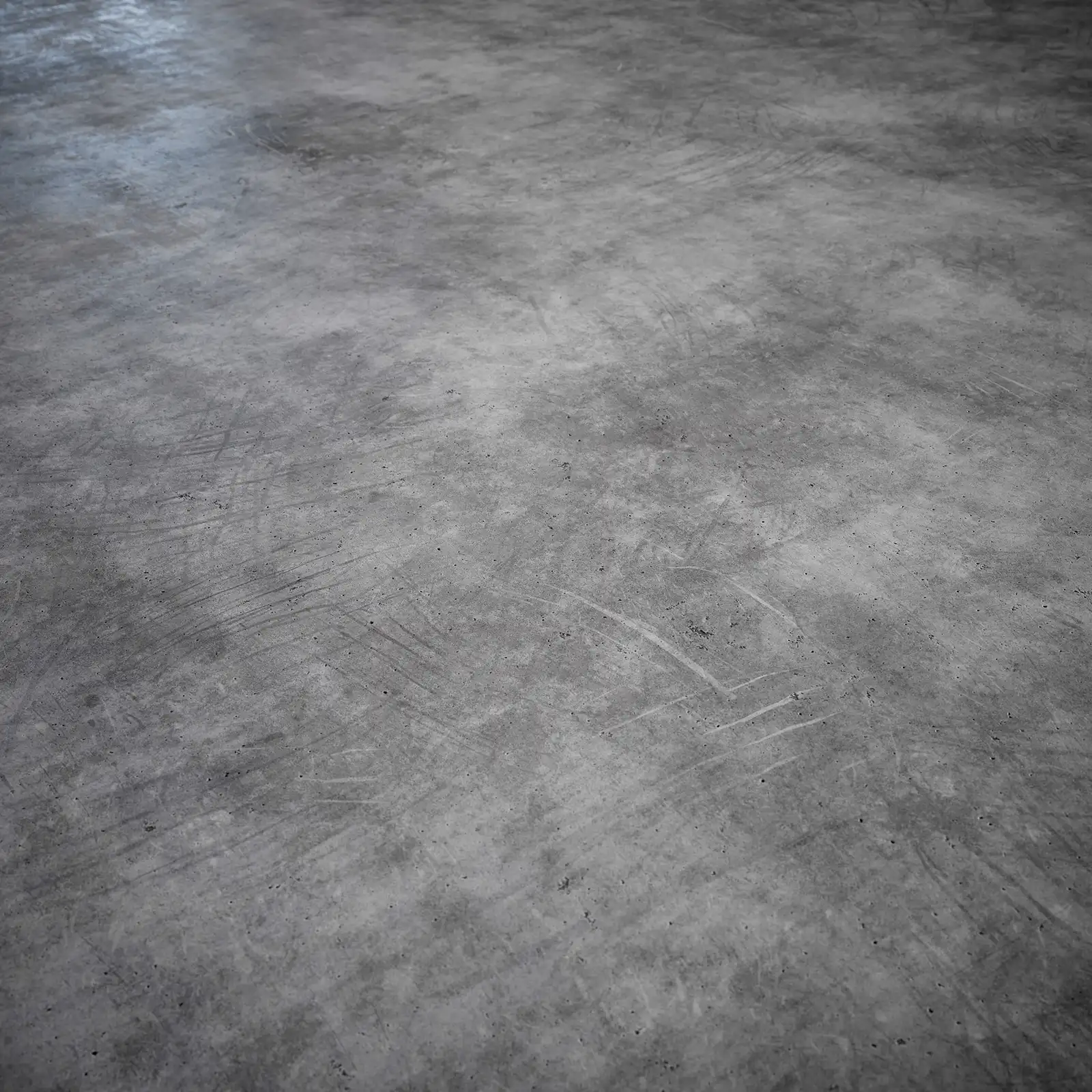 Weathered concrete texture featuring grey tones with visible surface scratches, wear marks, and natural aging patterns. Suitable for architectural visualization, game environments, and industrial scene rendering.