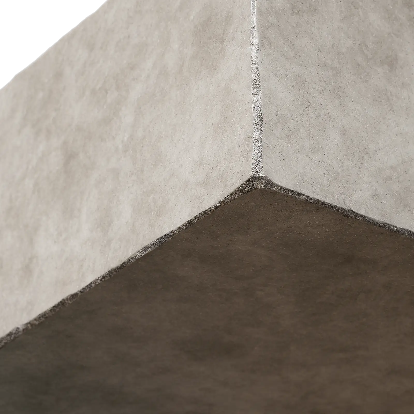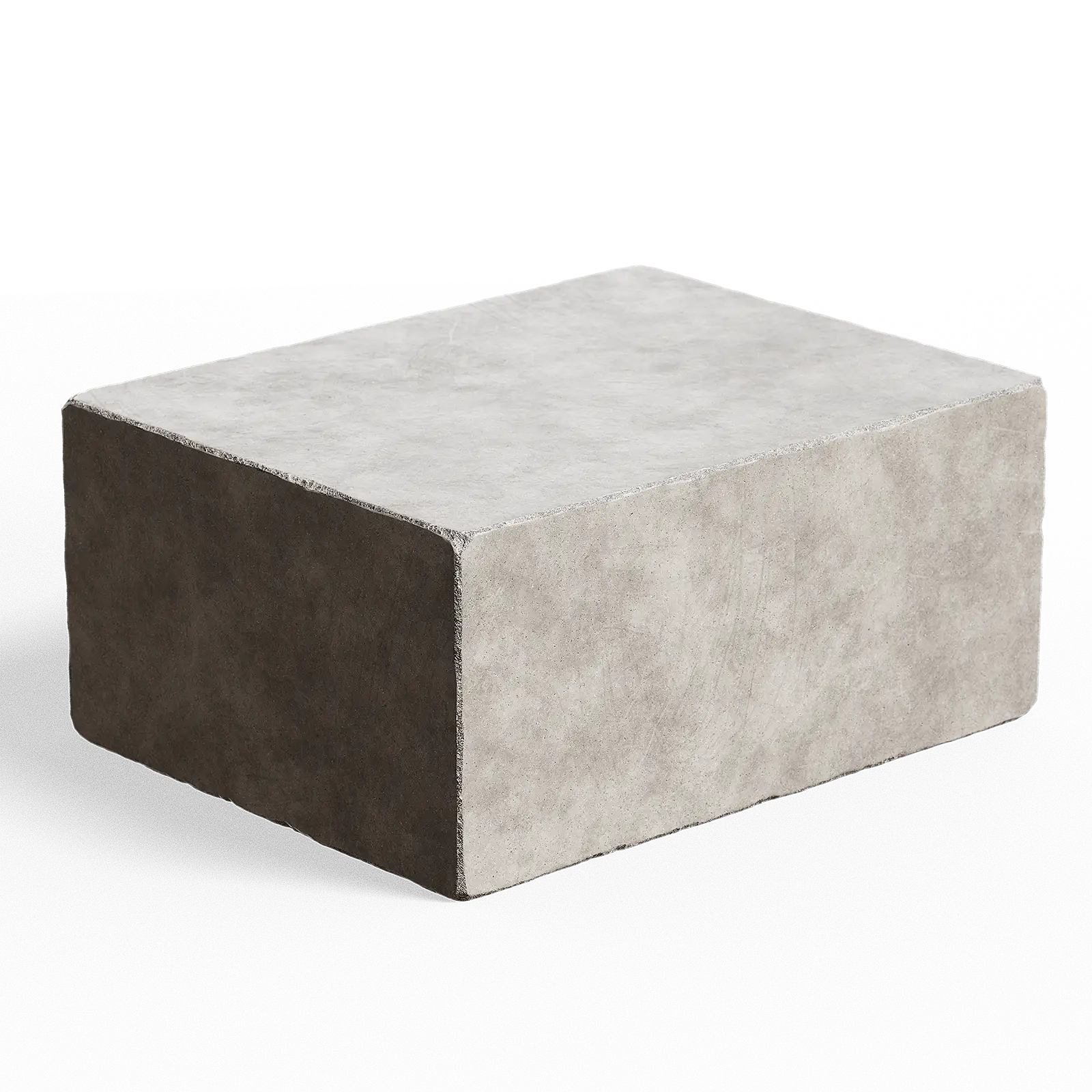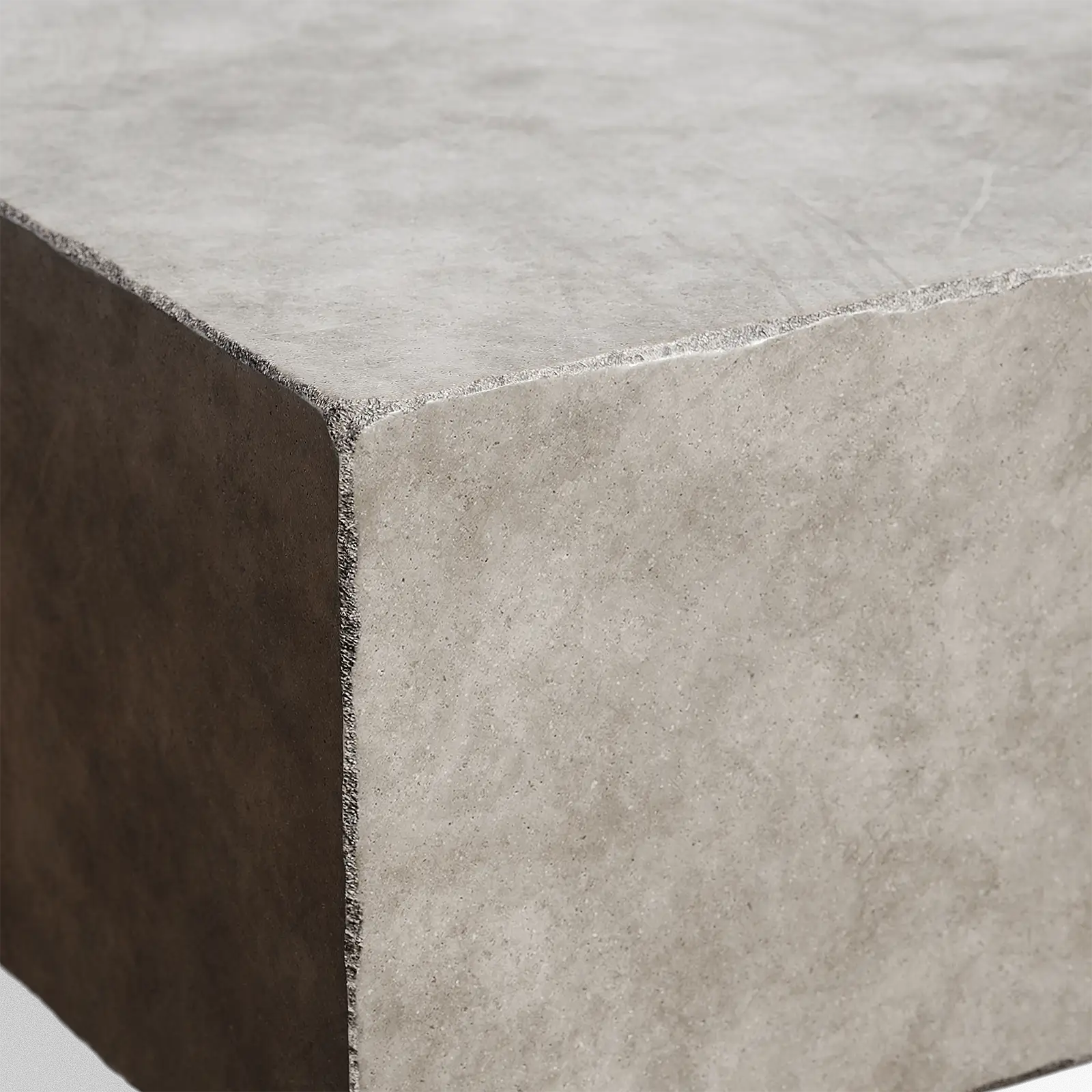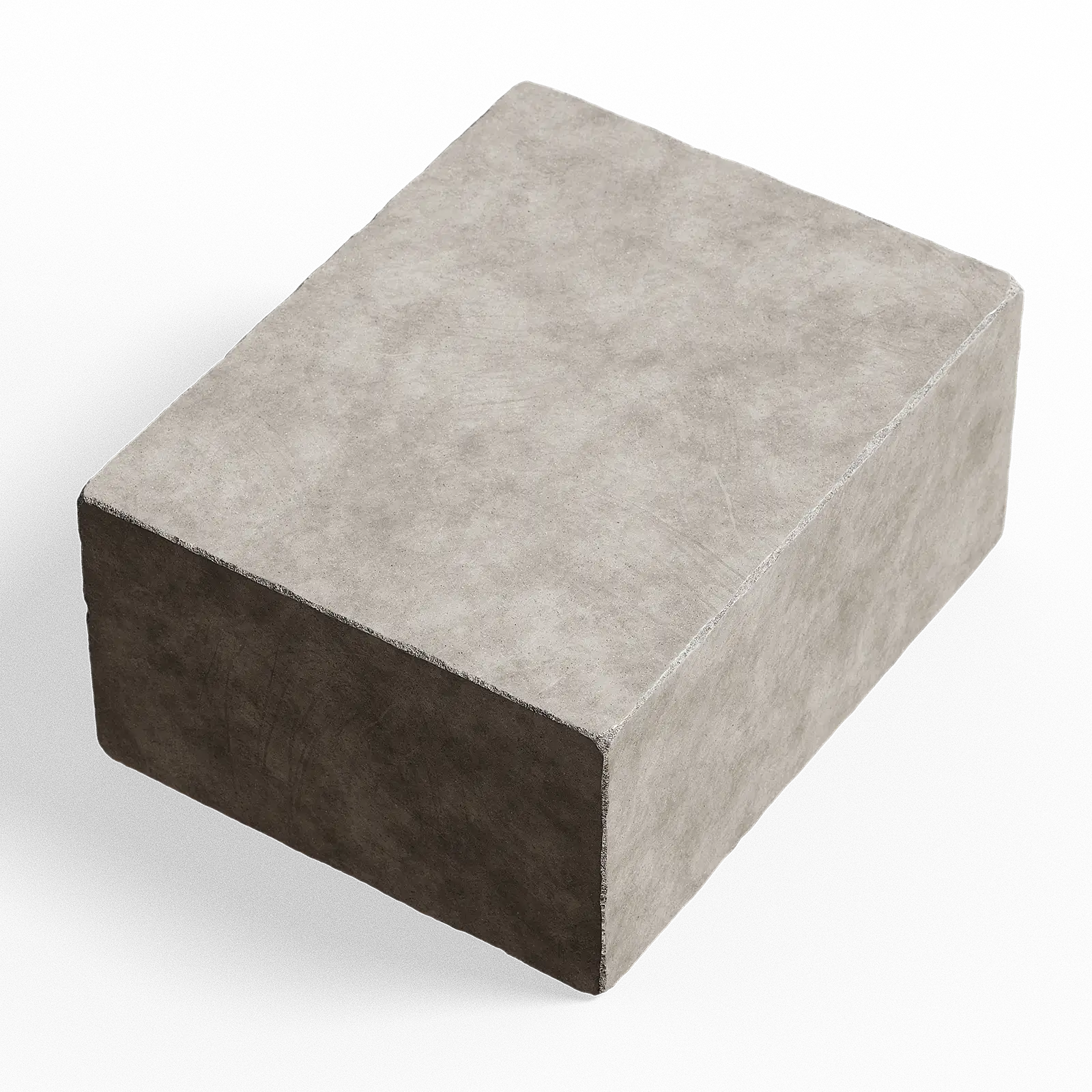 This concrete pedestal has a grey rectangular form with rough textured surfaces. The block shows natural concrete coloring with subtle variations across its faces. It can serve as an architectural base or display platform in urban scenes.