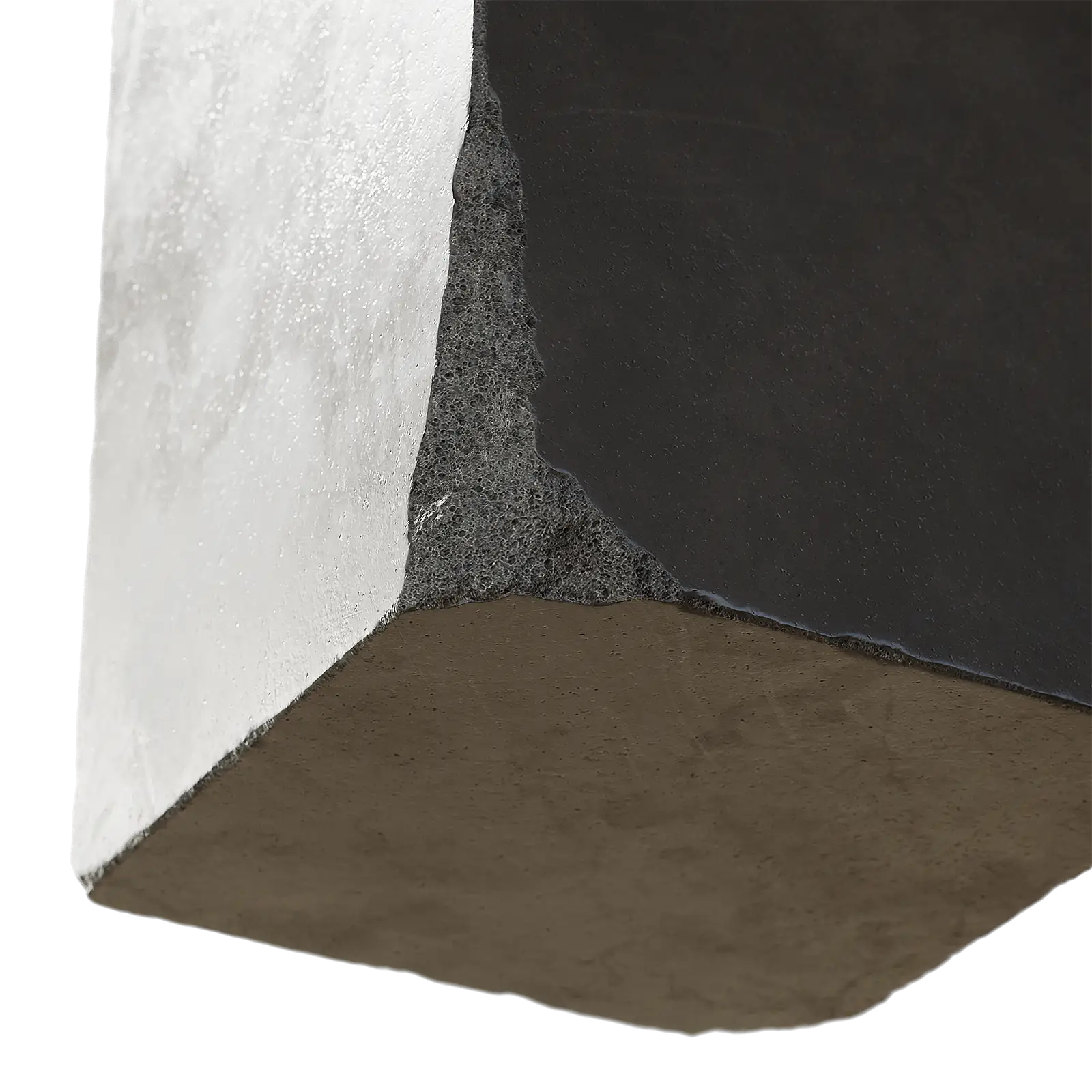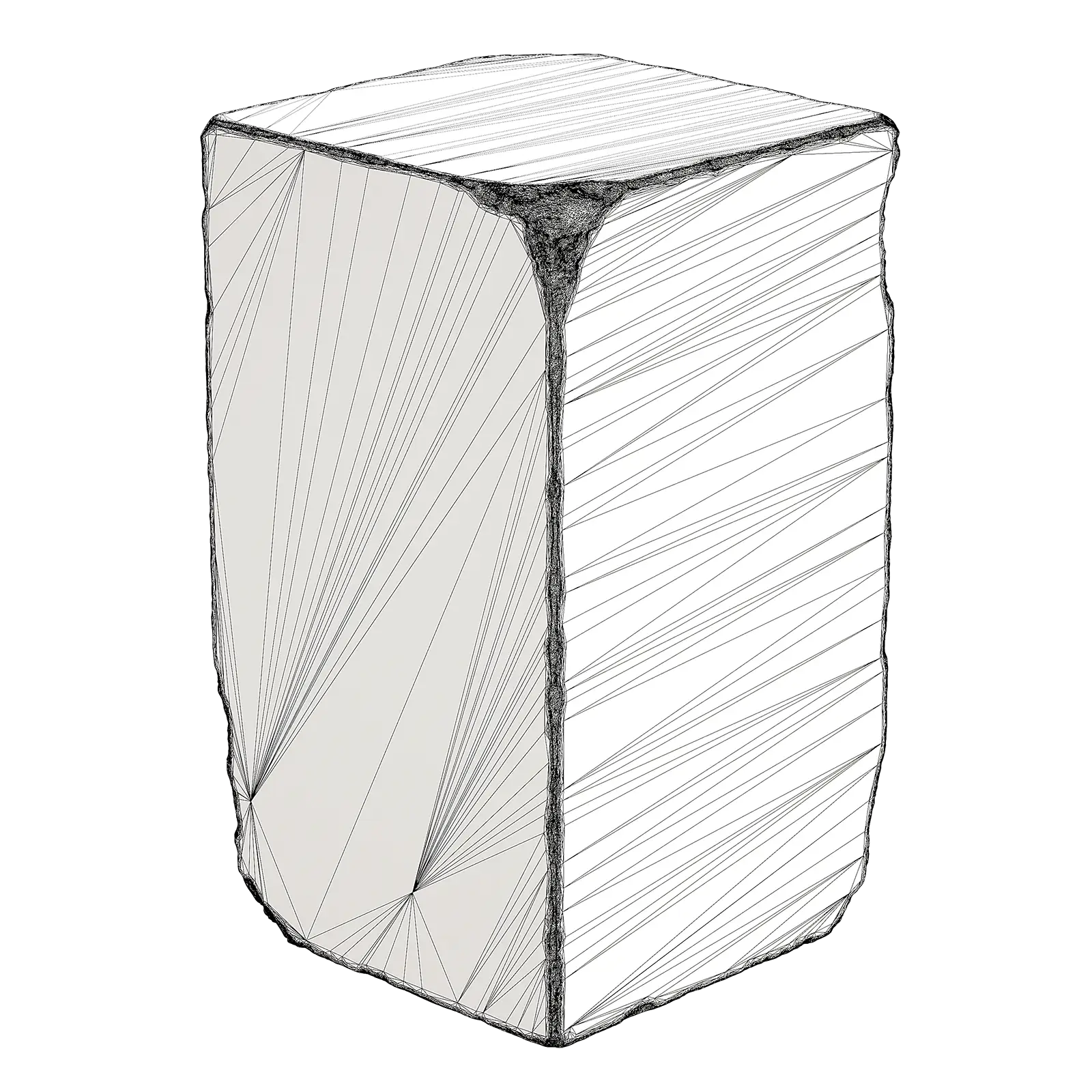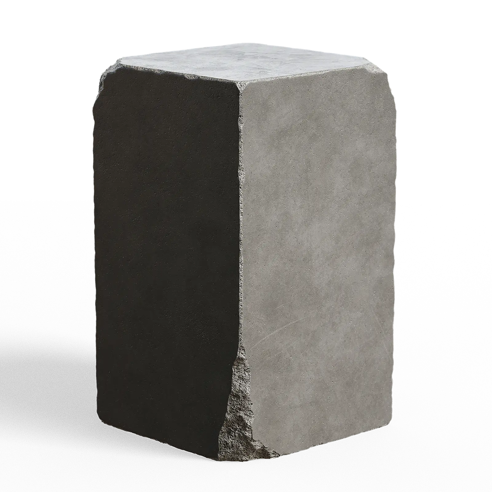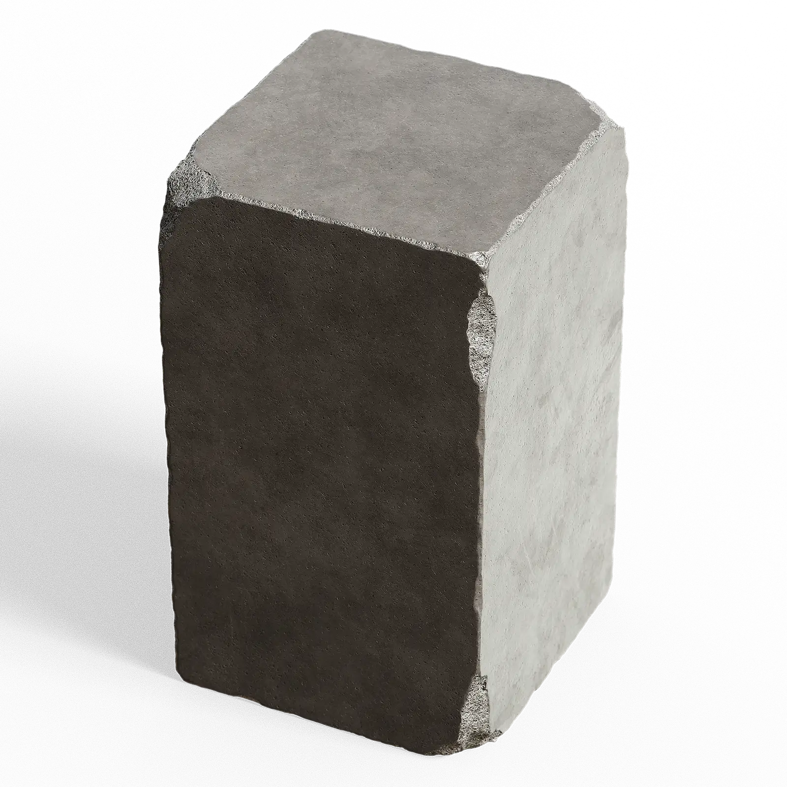 This concrete pedestal has a rough grey surface with visible aggregate texture. The block shows natural concrete characteristics with subtle color variations. The cubic form works well for architectural visualization and interior design scenes.