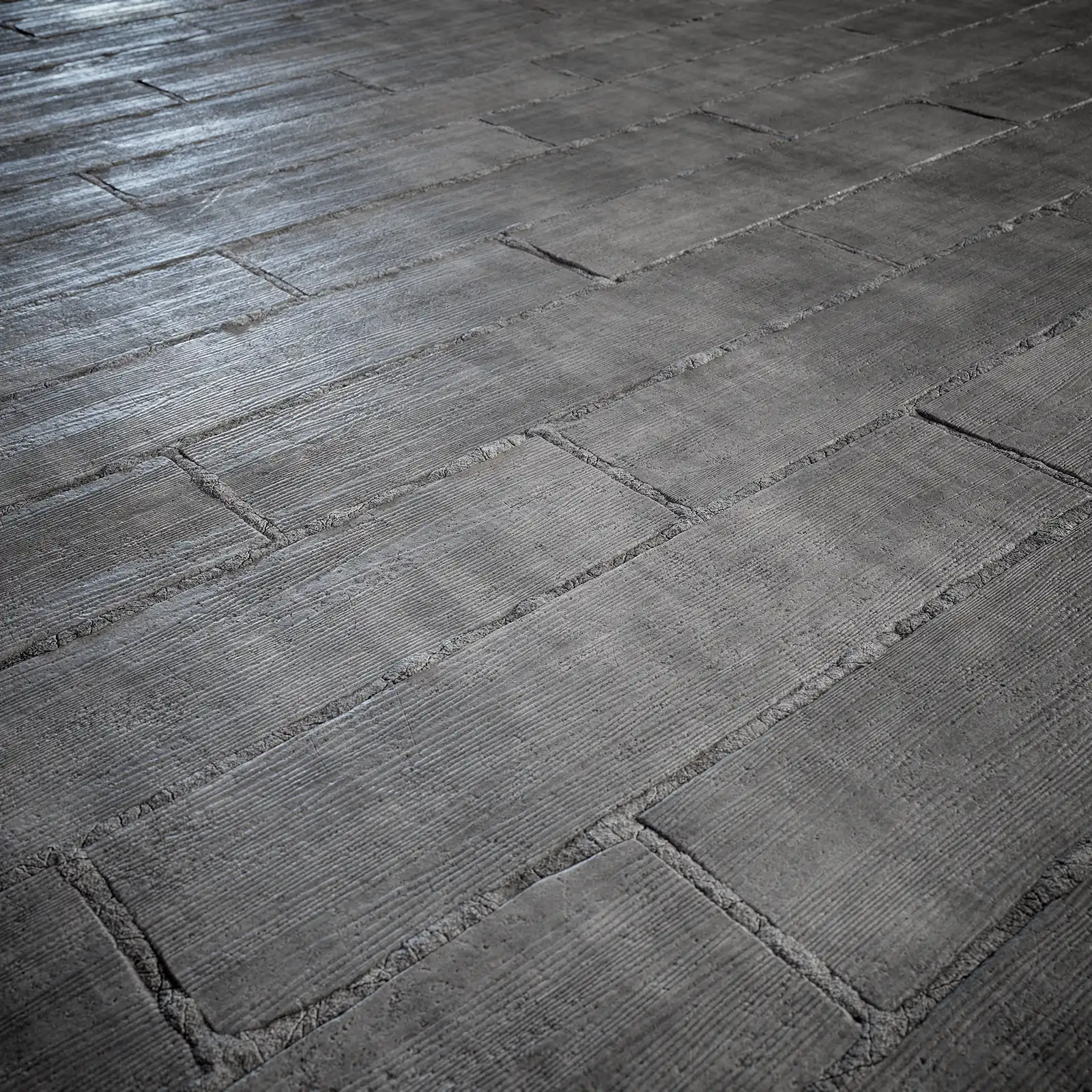 Weathered concrete slab texture featuring grey rectangular blocks with visible cracks, worn edges, and rough surface details. Suitable for architectural visualization, construction scenes, industrial environments, and urban building exteriors.