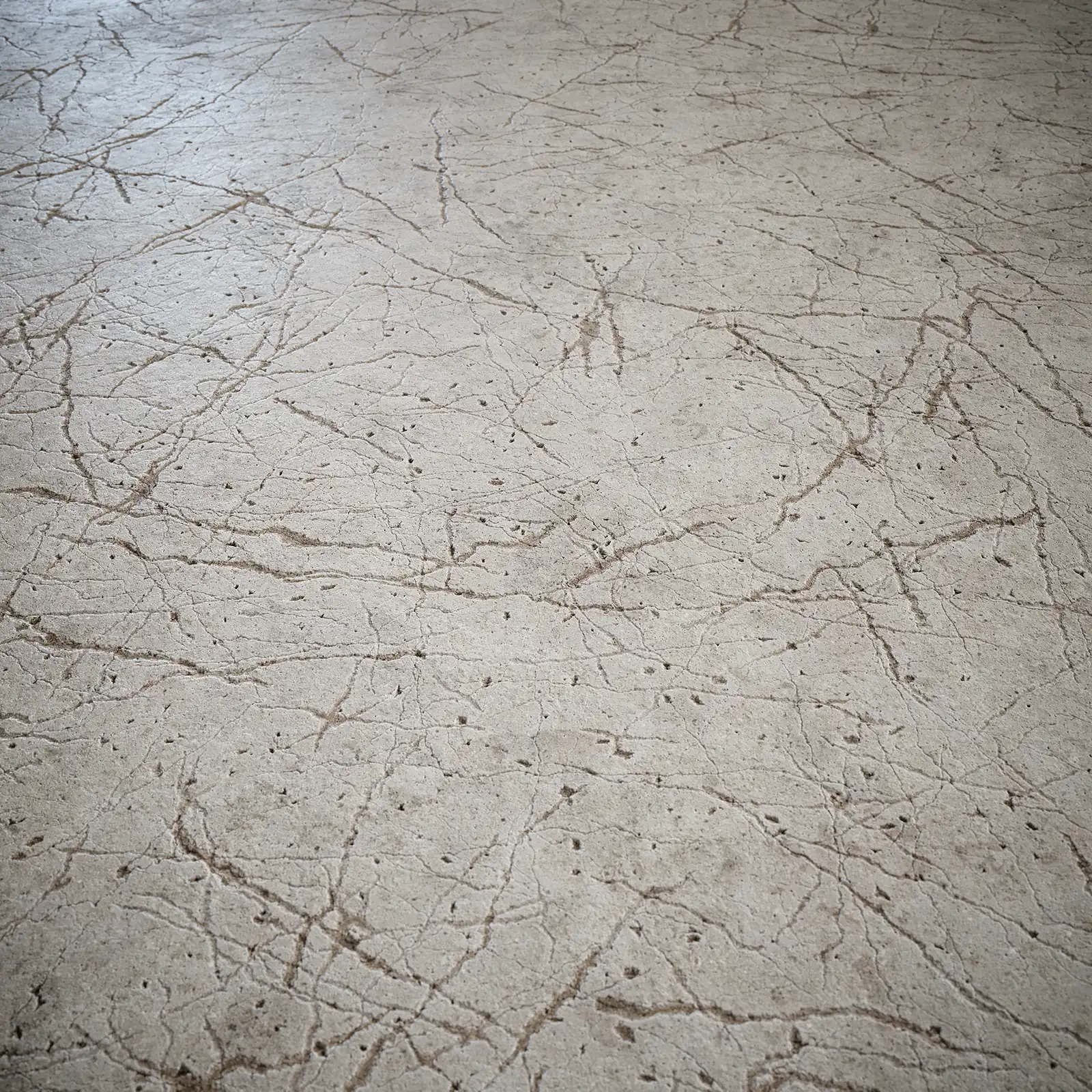 This plaster texture has a beige color with extensive crack patterns across the surface. The material shows weathered damage with fine lines and small holes throughout. Works well for aged interior walls and architectural visualization projects.