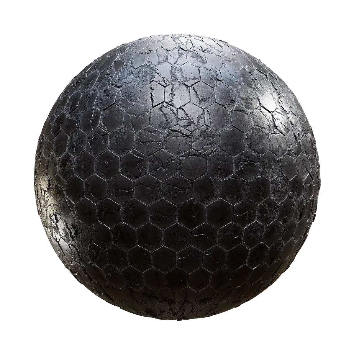 Cracked Black Hexagonal Tiles PBR Texture with maps: basecolor/diffuse, glossiness, height (TIFF), IOR, metallic, normal (DirectX), normal (OpenGL), reflection, roughness and specular. Resolution: 8192x8192px and 4096x4096px.