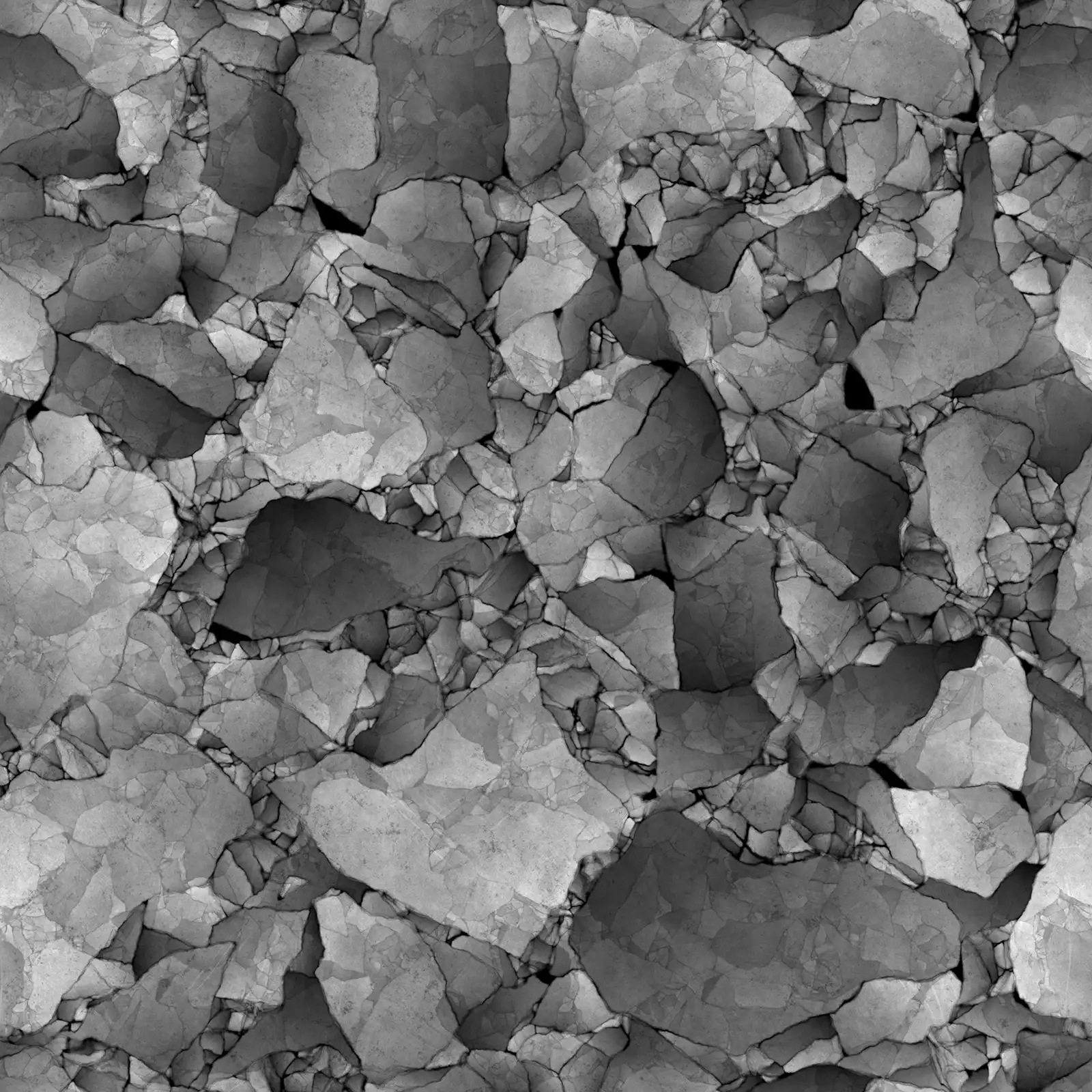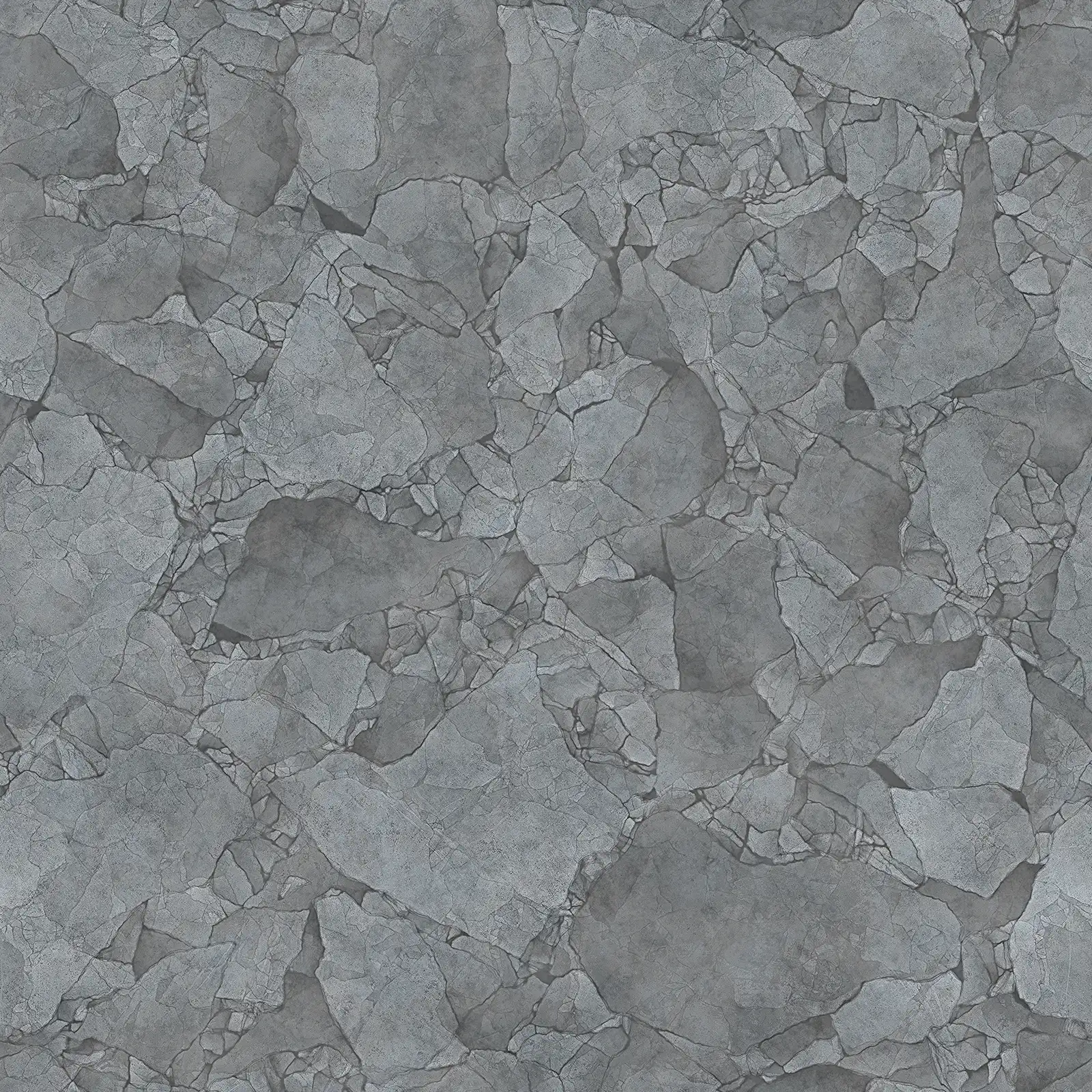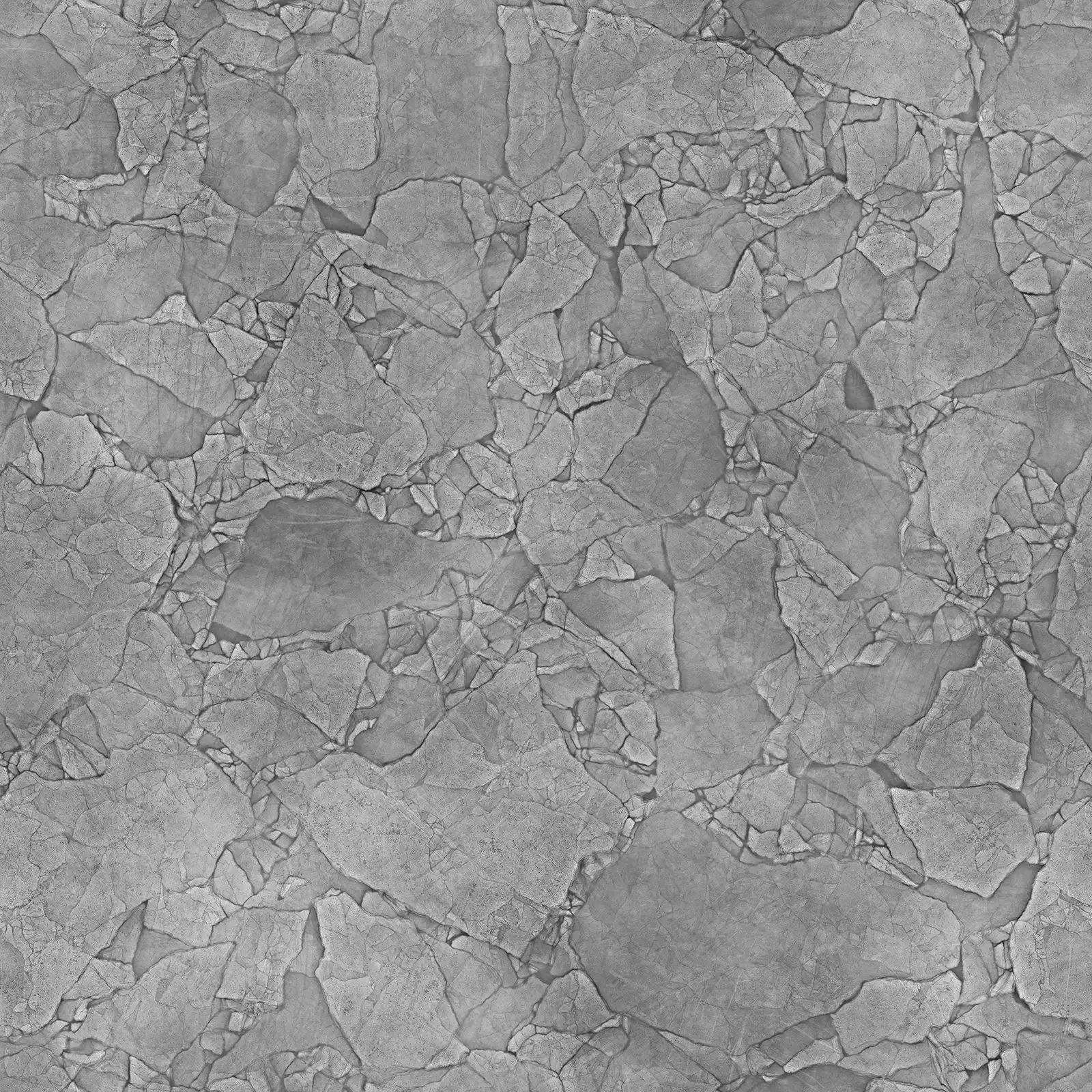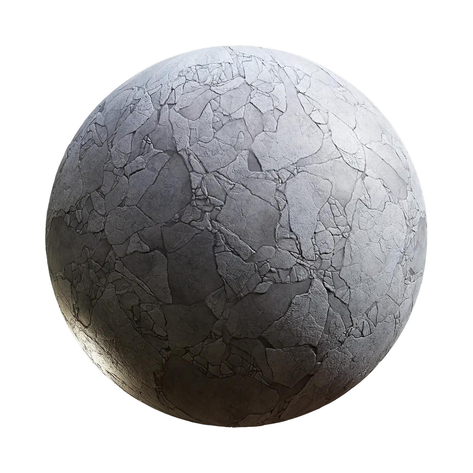 Cracked concrete PBR texture featuring extensive fissure patterns across a grey and white surface with weathered appearance. Suitable for architectural visualization, post-apocalyptic environments, damaged building surfaces, and industrial scene applications requiring realistic concrete materials with structural damage details.
