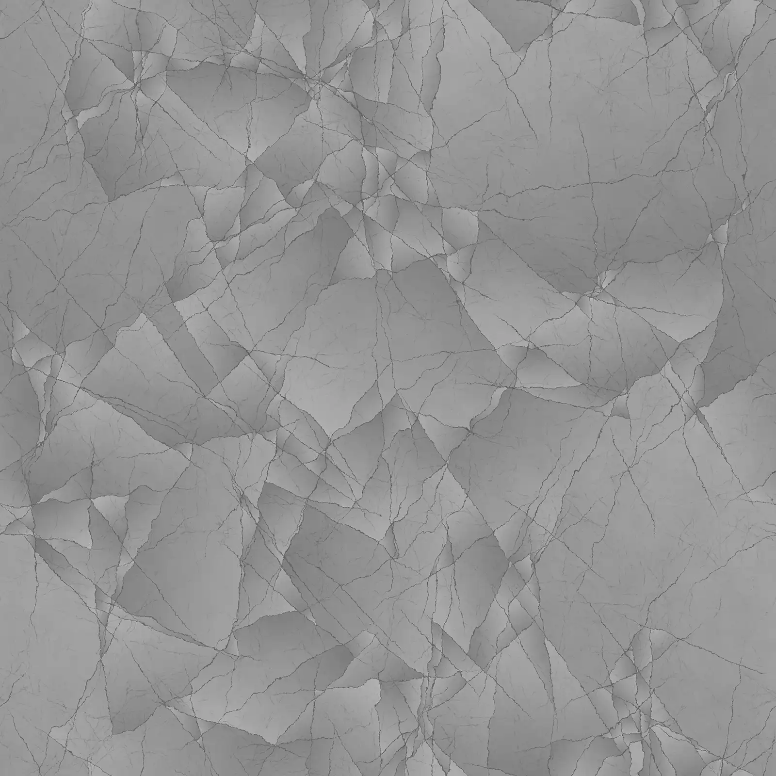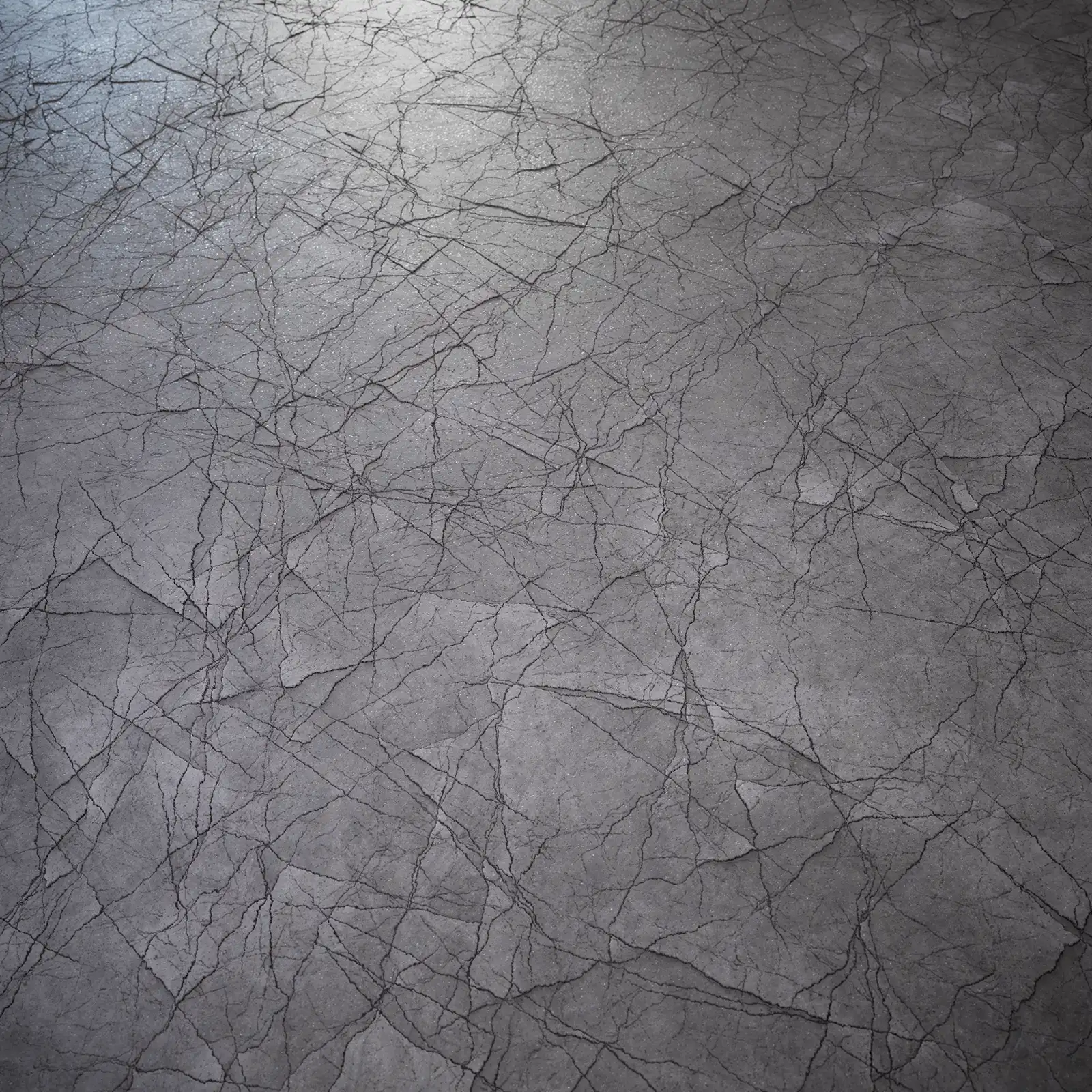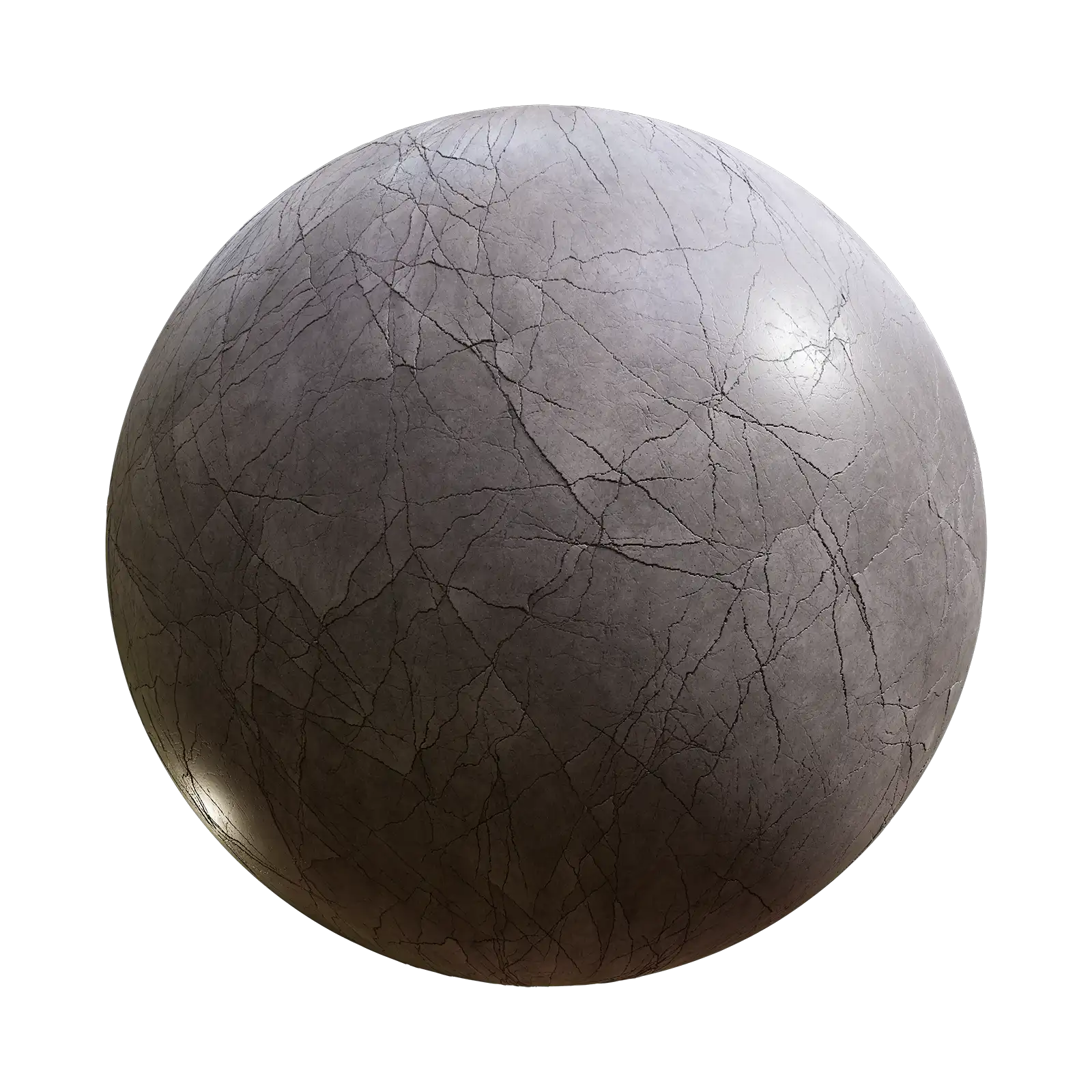 Polished concrete PBR texture featuring extensive crack patterns across a smooth grey surface with subtle reflective properties. Suitable for architectural visualization, damaged infrastructure scenes, weathered building exteriors, and realistic surface materials in 3D environments.