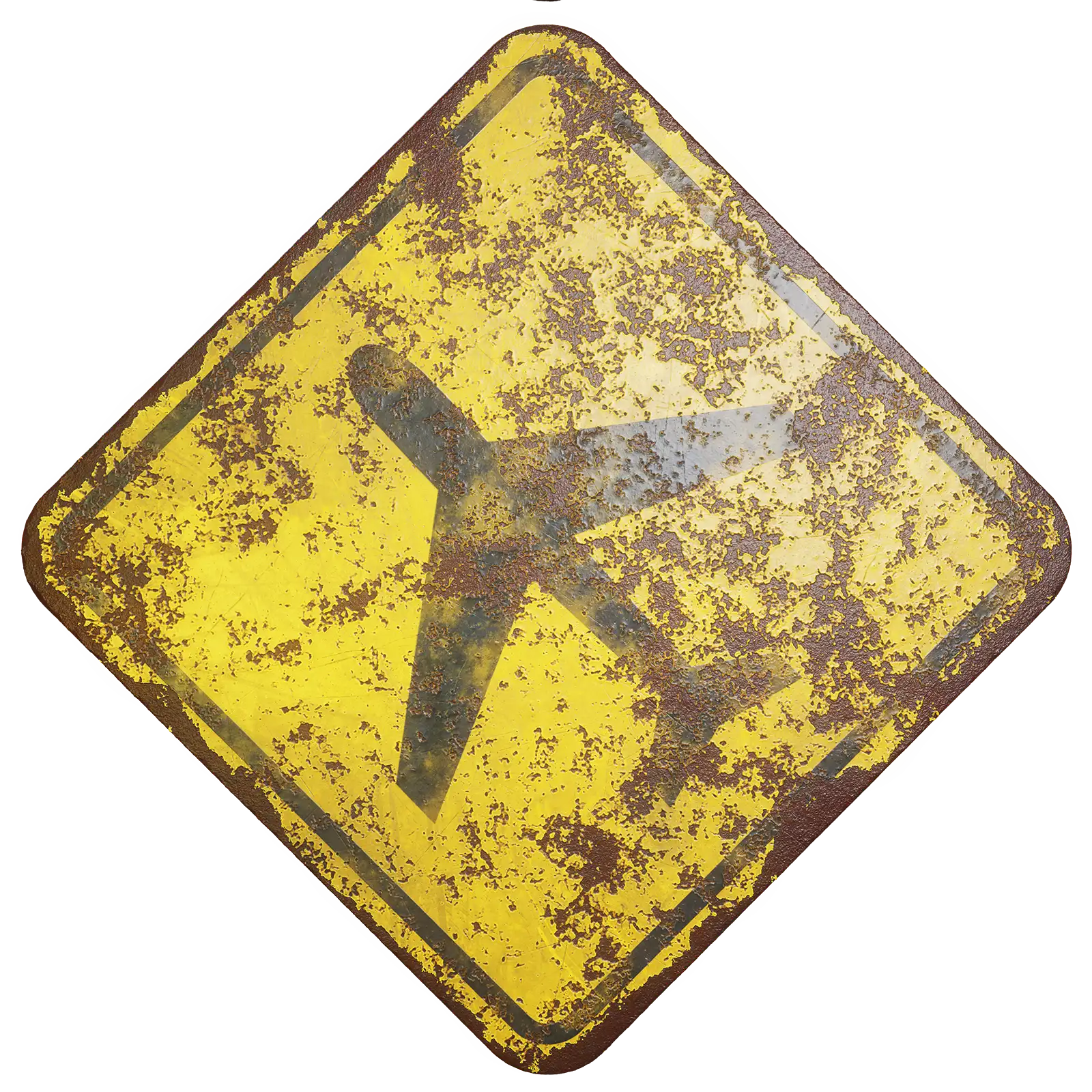 Damaged Airport Warning Sign with maps: basecolor/diffuse, glossiness, height (TIFF), IOR, metallic, normal (DirectX), normal (OpenGL), reflection, roughness and specular. Resolution: 8192x8192px and 4096x4096px.