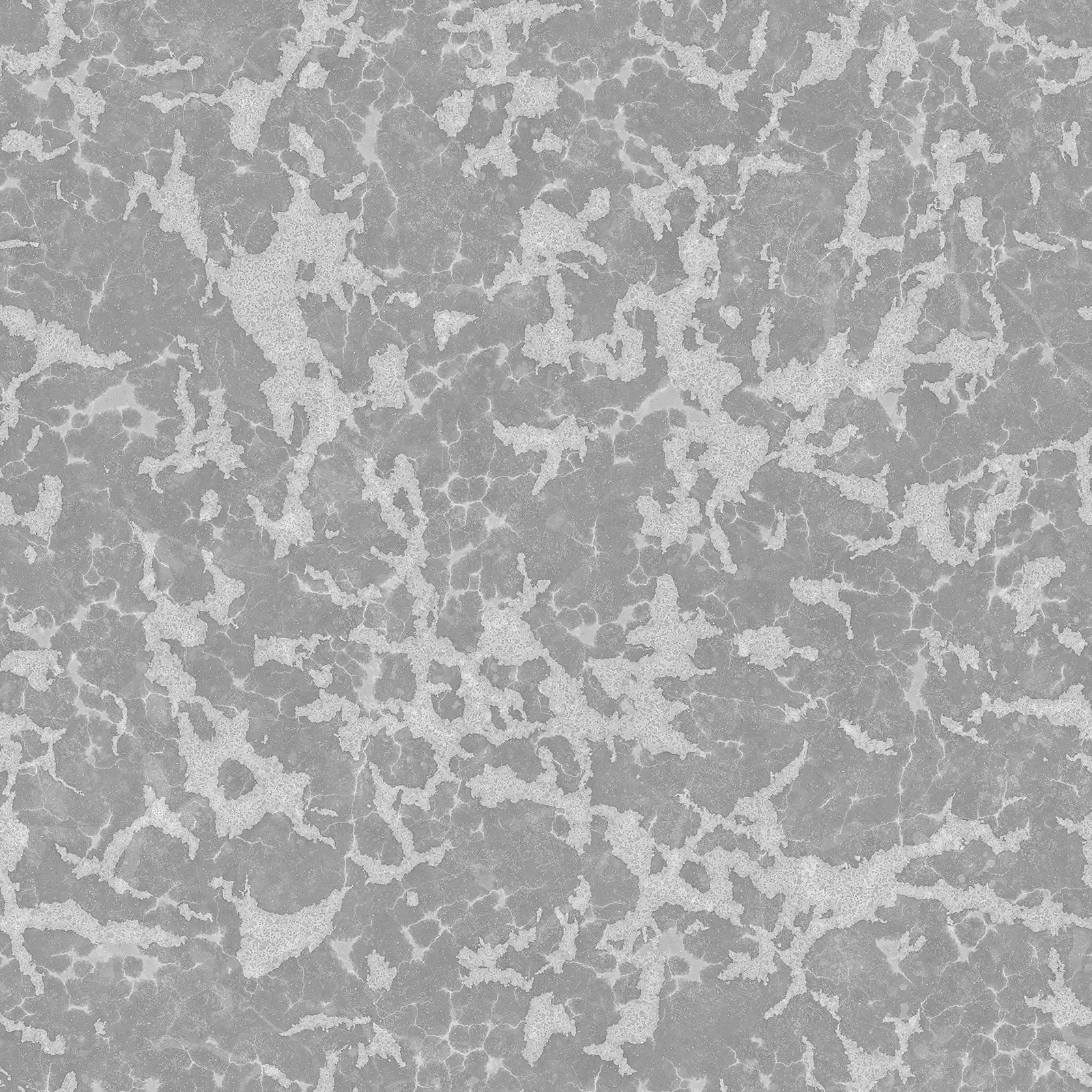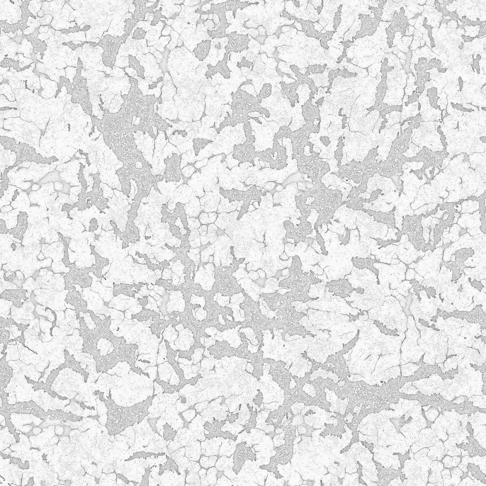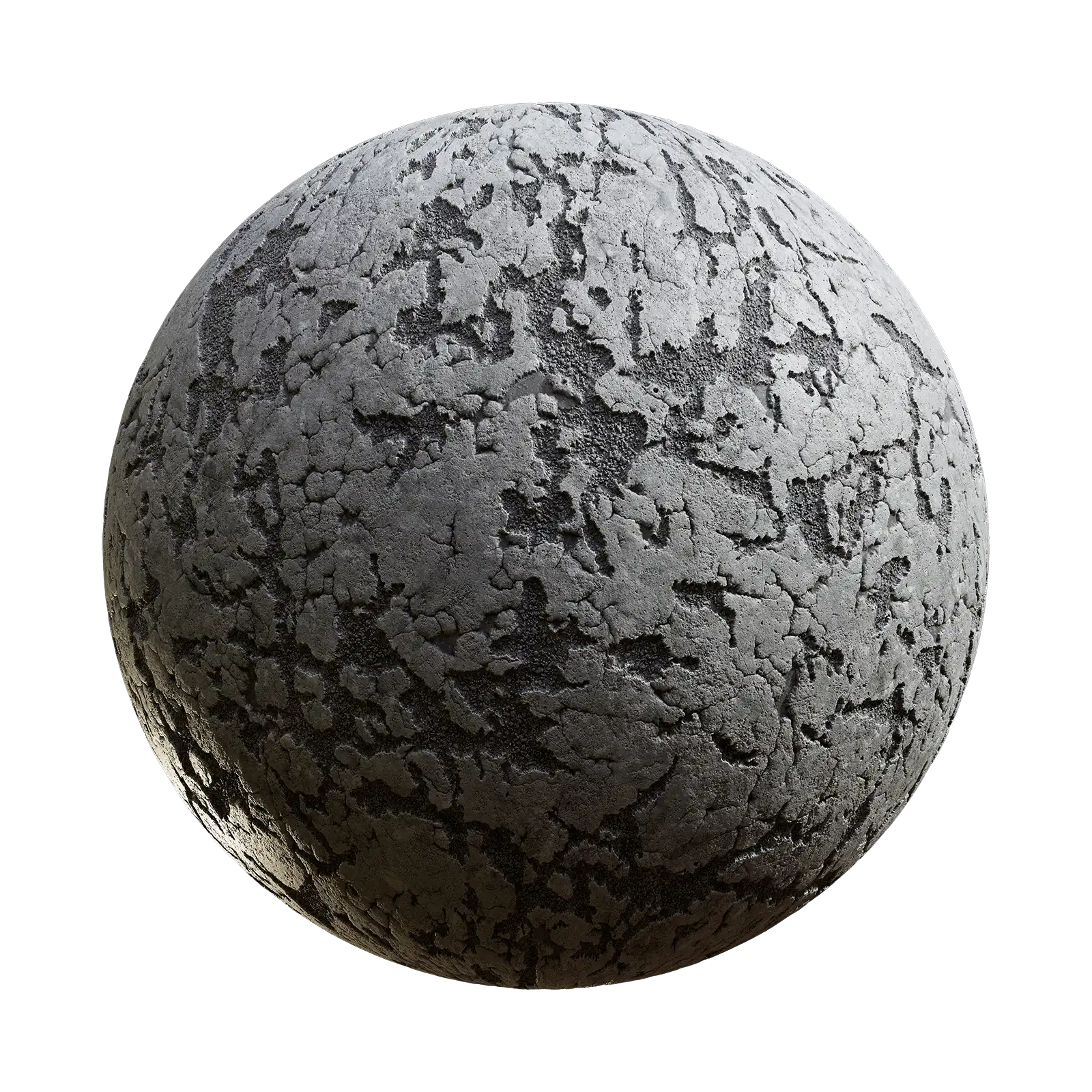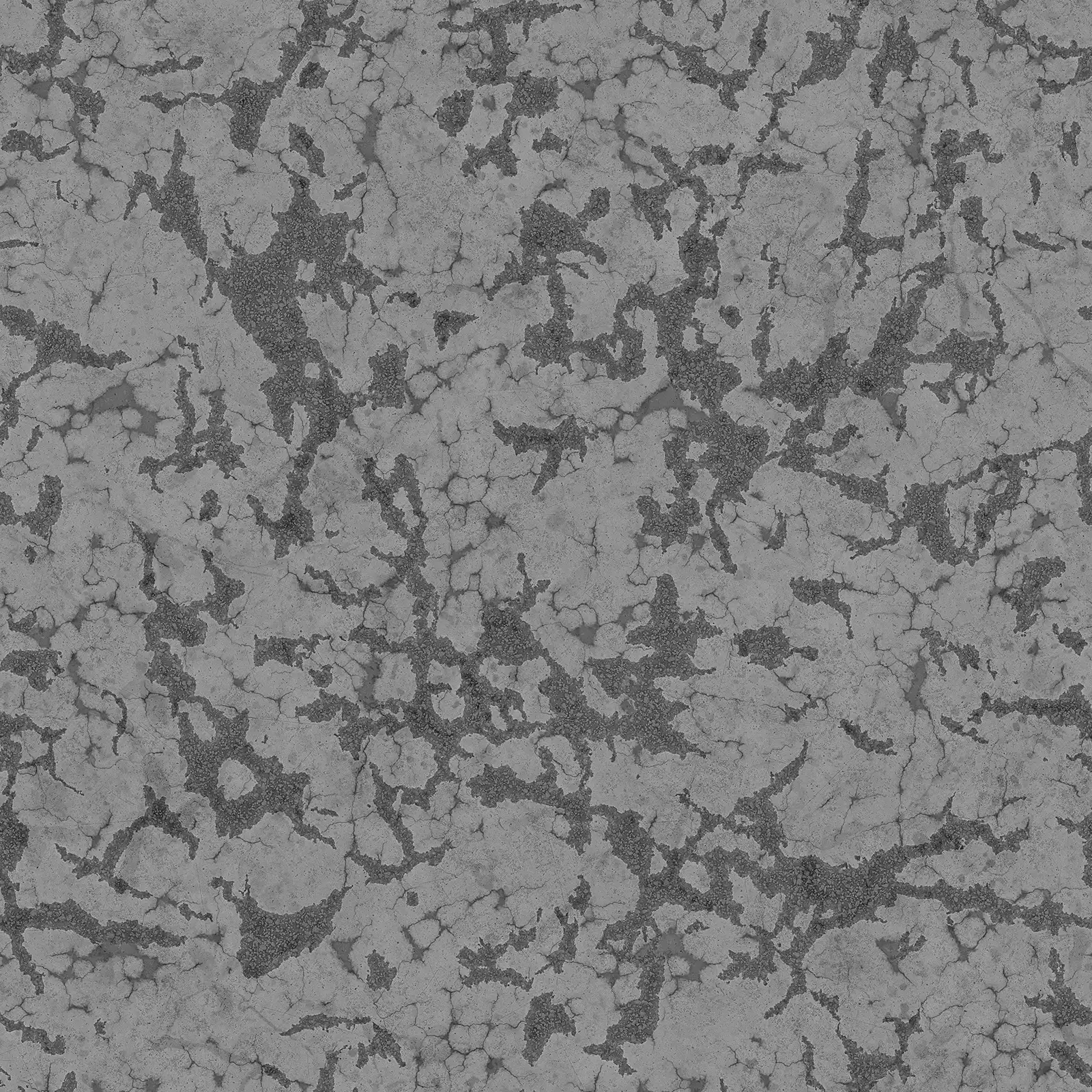 Damaged concrete texture featuring extensive cracking, surface wear, and weathered appearance in grey tones. This PBR material is suitable for architectural visualization, construction scenes, post-apocalyptic environments, and urban decay projects.