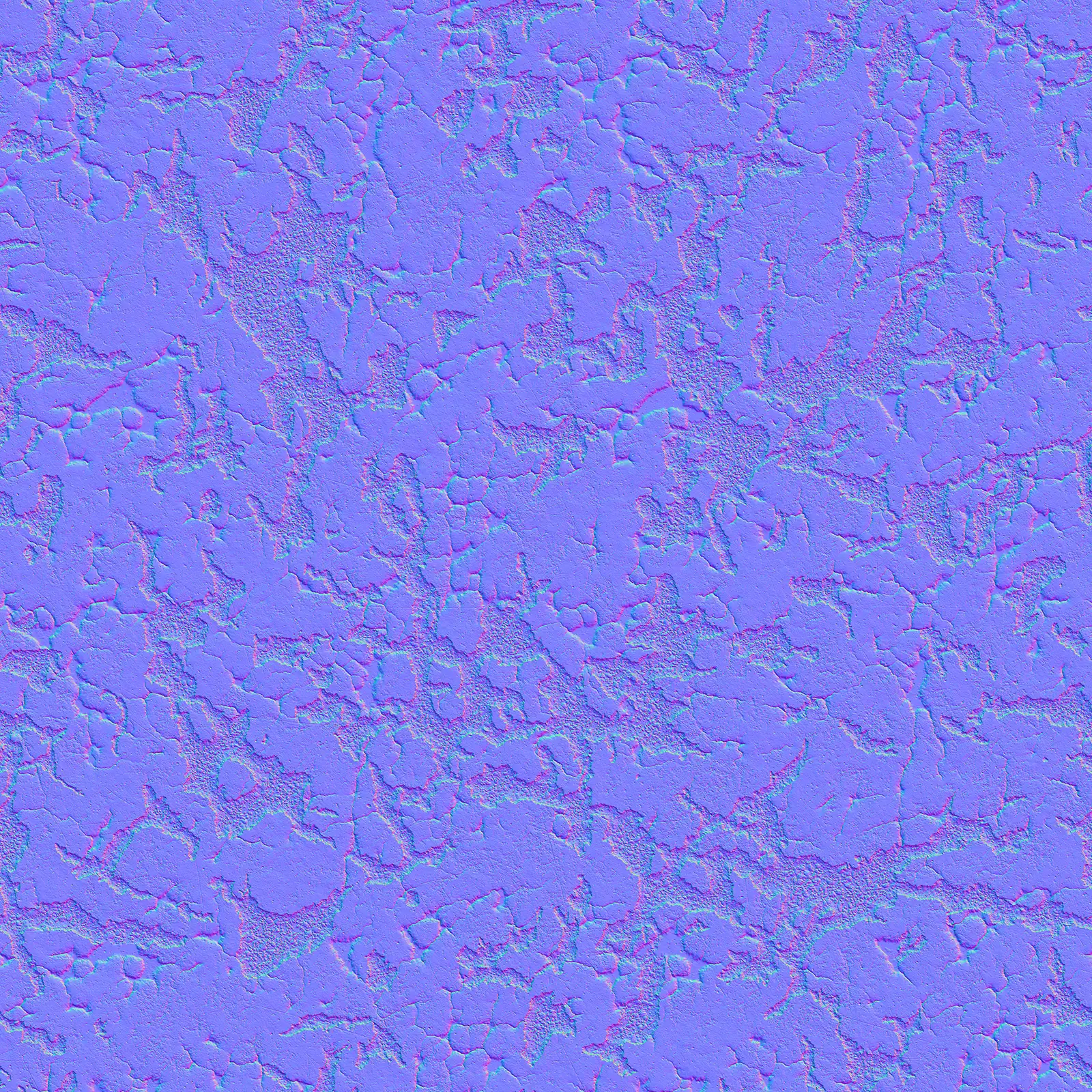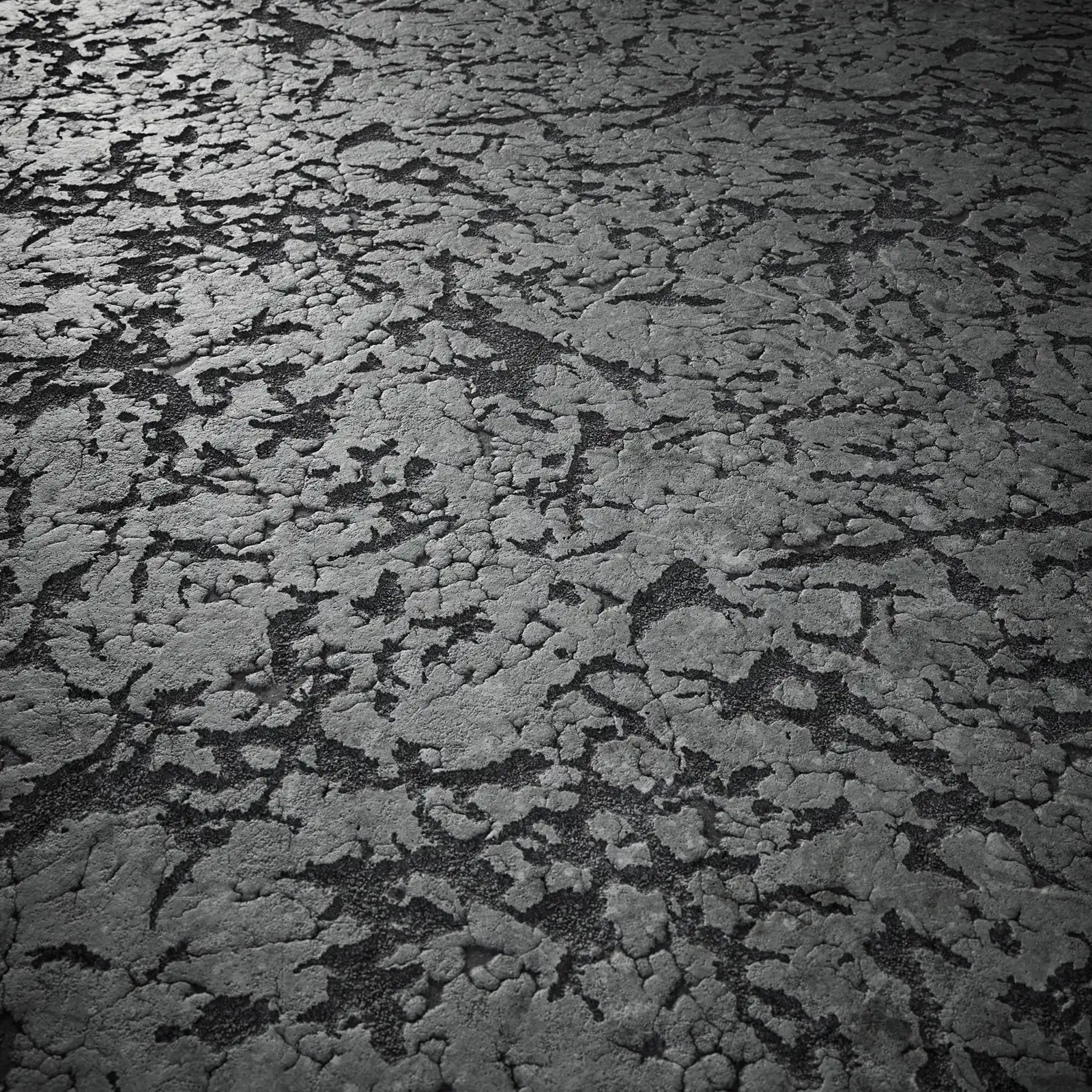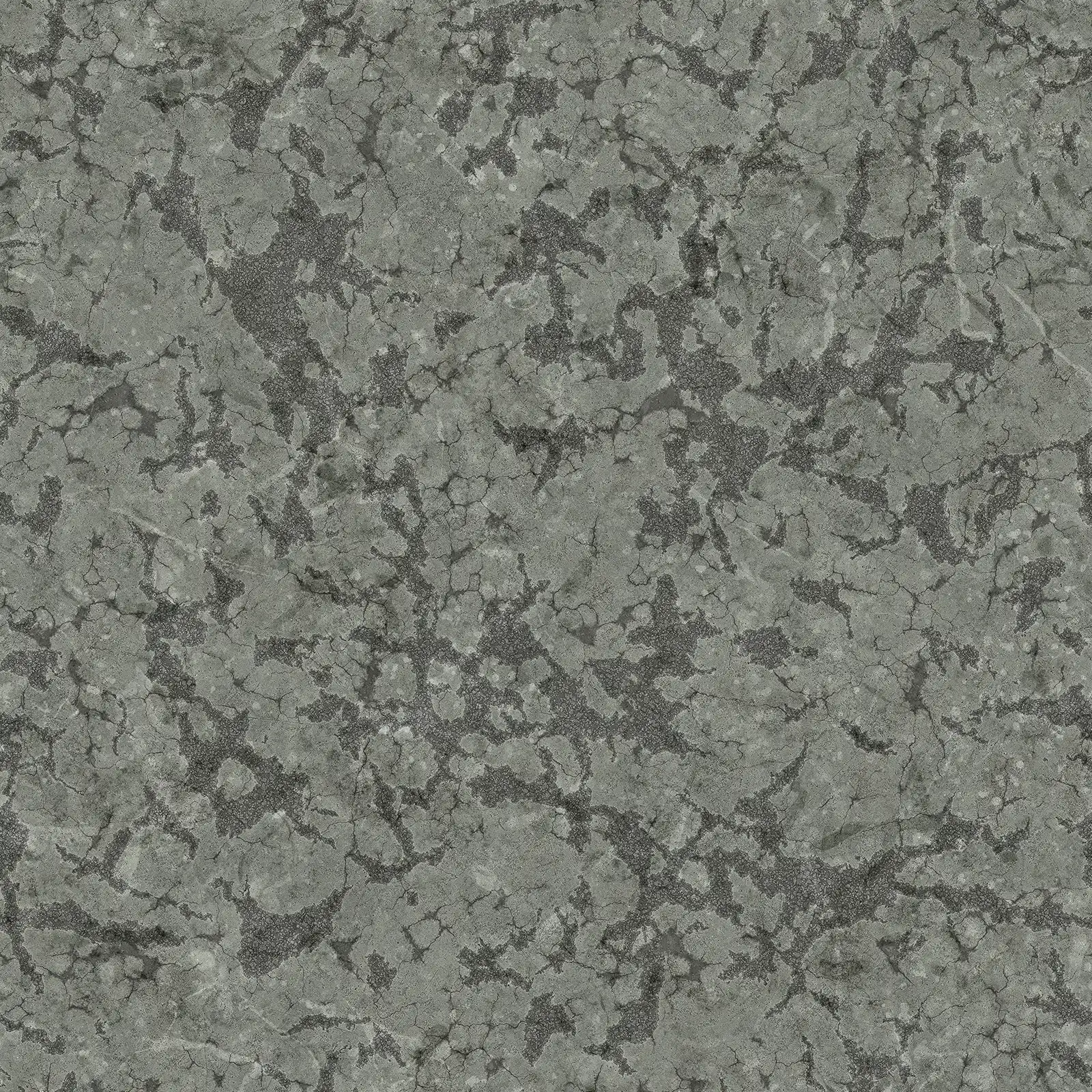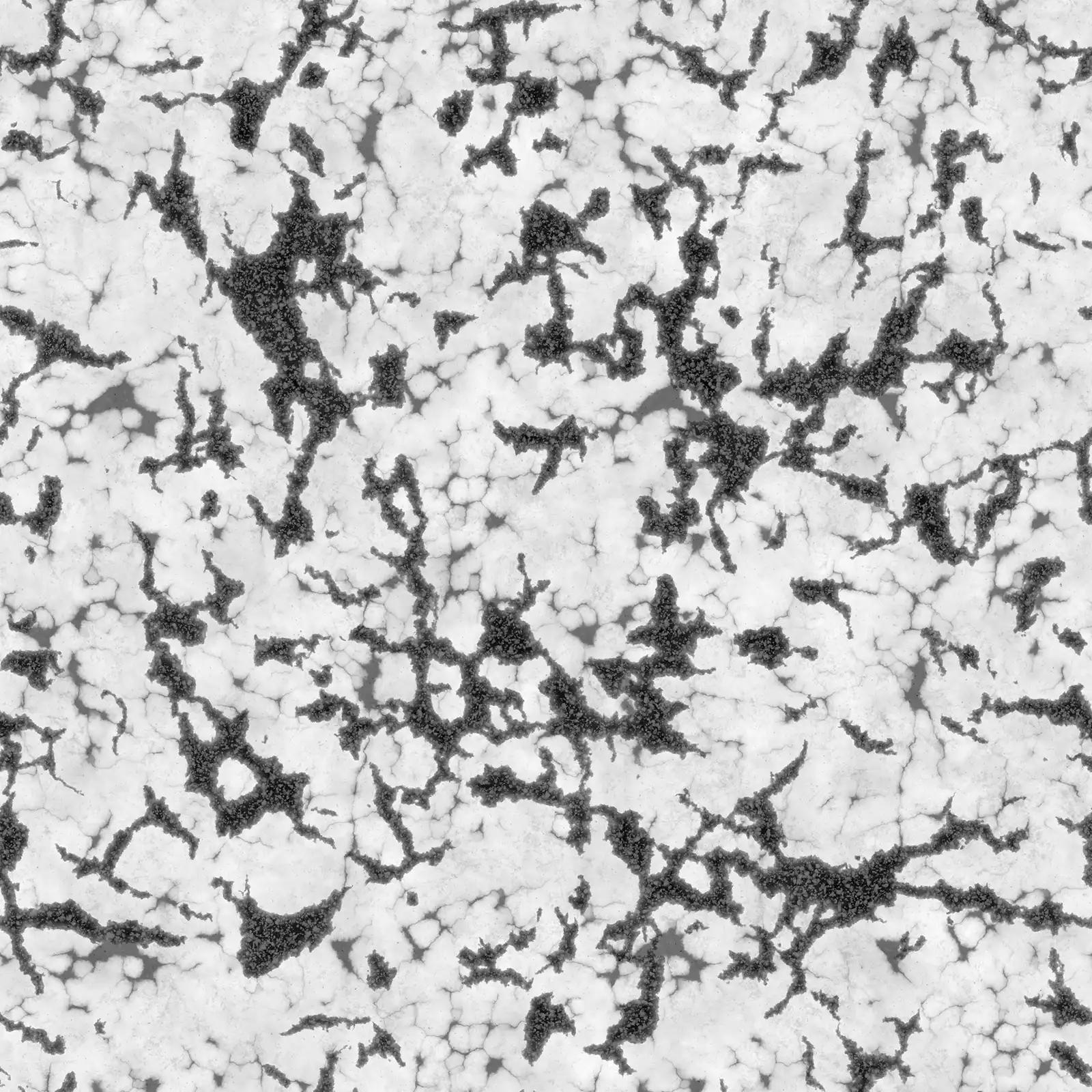 Damaged concrete texture featuring extensive cracking, surface wear, and weathered appearance in grey tones. This PBR material is suitable for architectural visualization, construction scenes, post-apocalyptic environments, and urban decay projects.