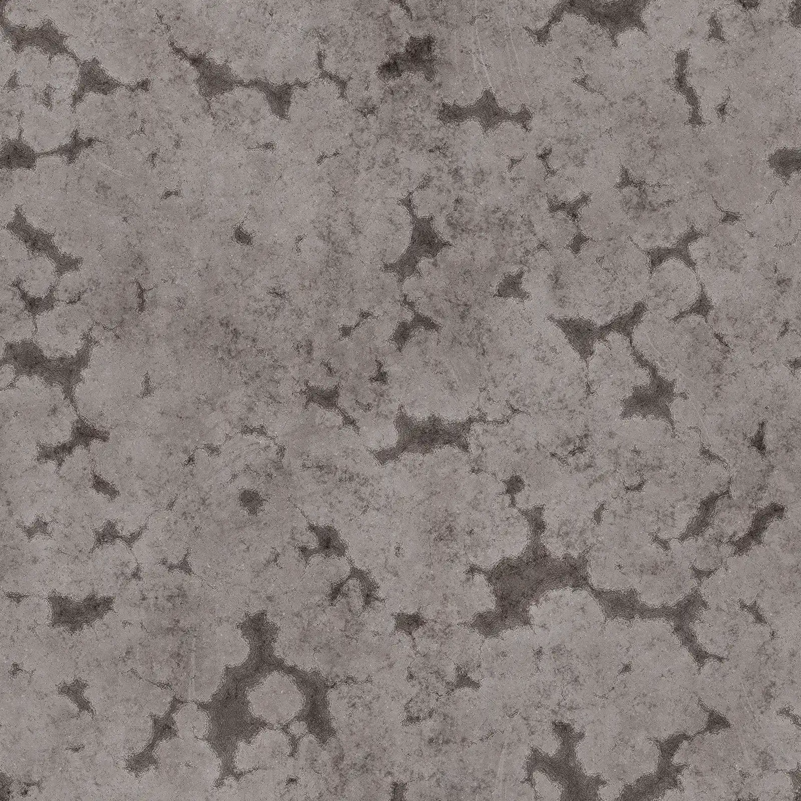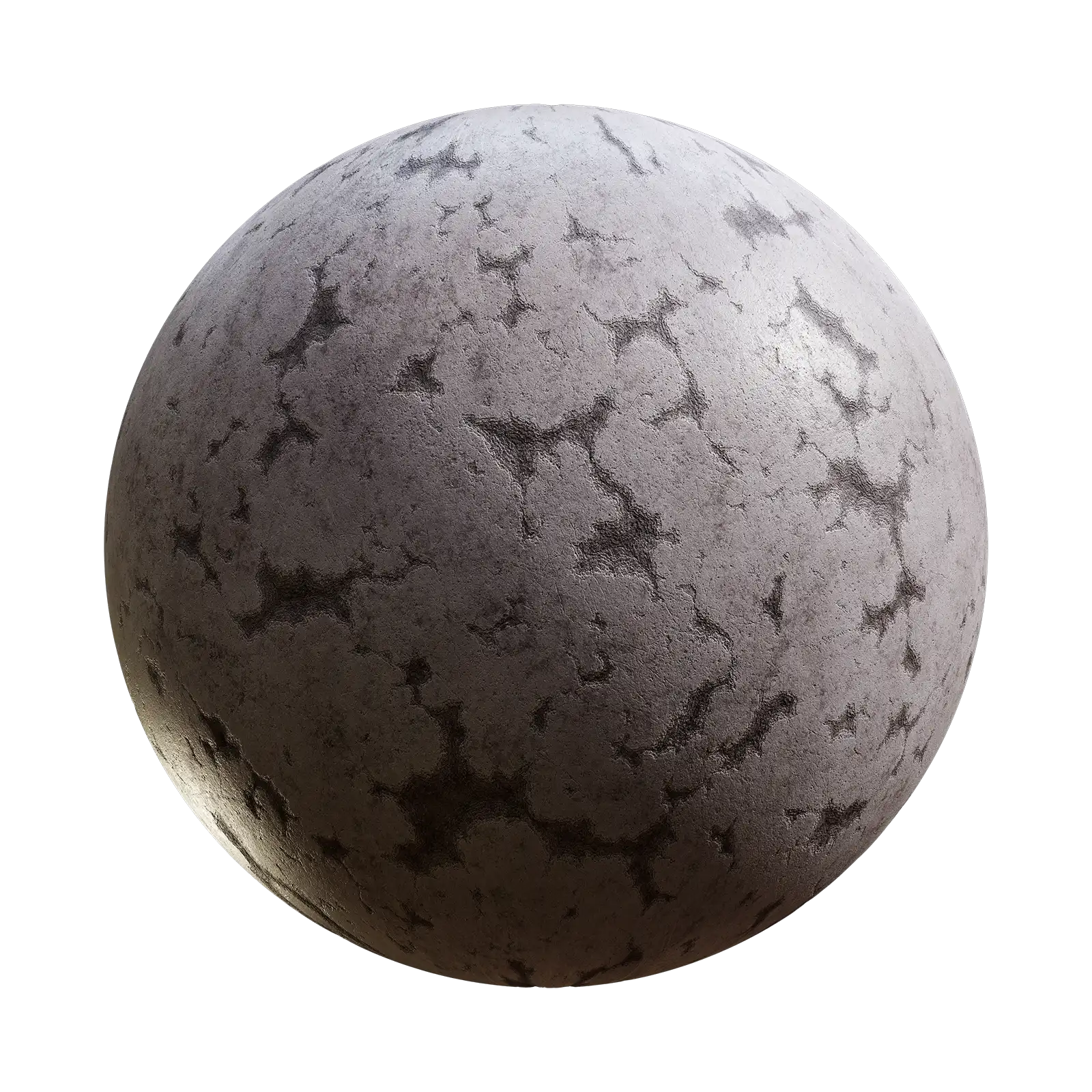 Damaged concrete PBR texture featuring weathered grey-brown surface with visible cracks, stains, and deterioration patterns. This construction material texture is suitable for architectural visualizations, urban environments, and industrial scenes requiring realistic weathered concrete surfaces.