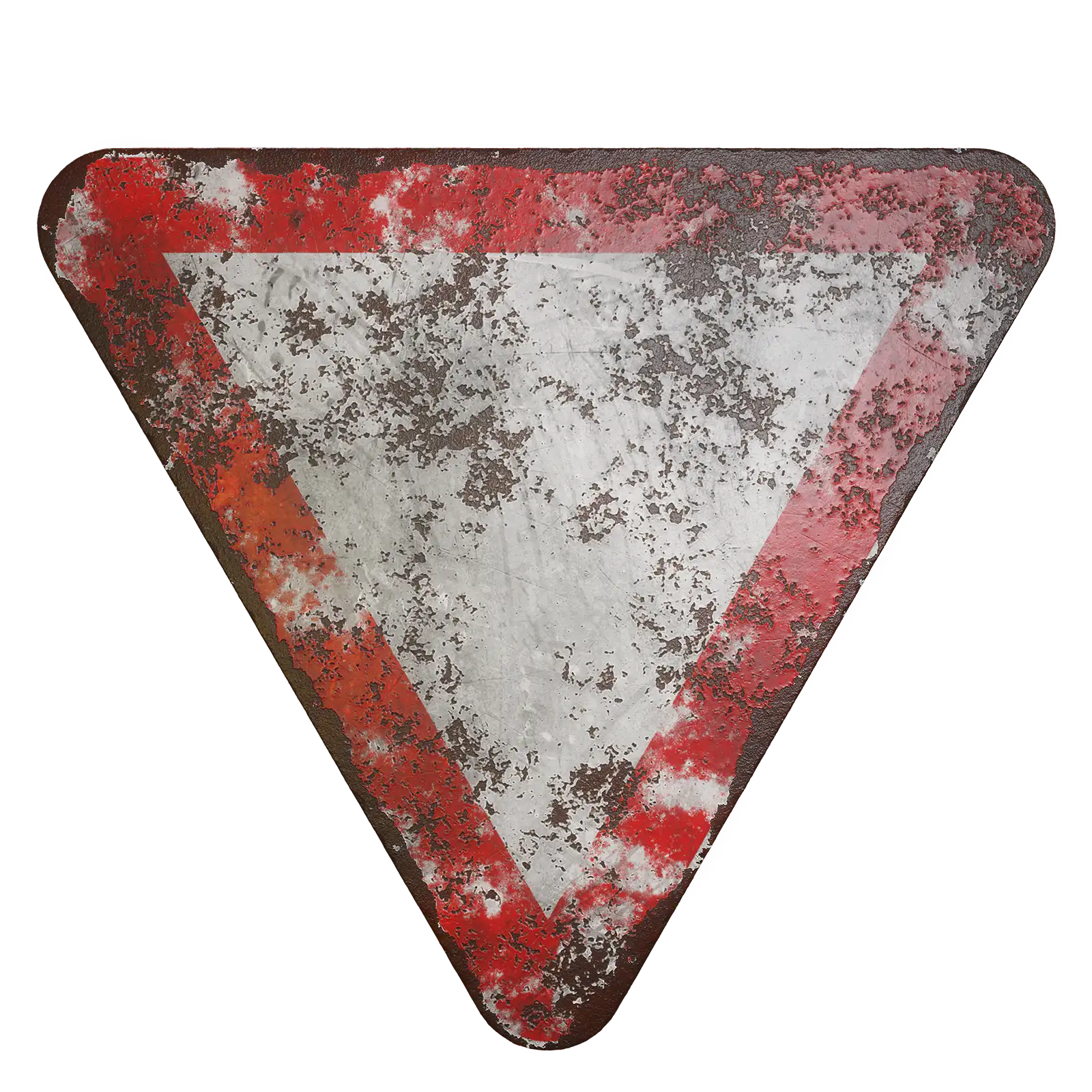 Damaged Give Way Sign with maps: basecolor/diffuse, glossiness, height (TIFF), IOR, metallic, normal (DirectX), normal (OpenGL), reflection, roughness and specular. Resolution: 8192x8192px and 4096x4096px.