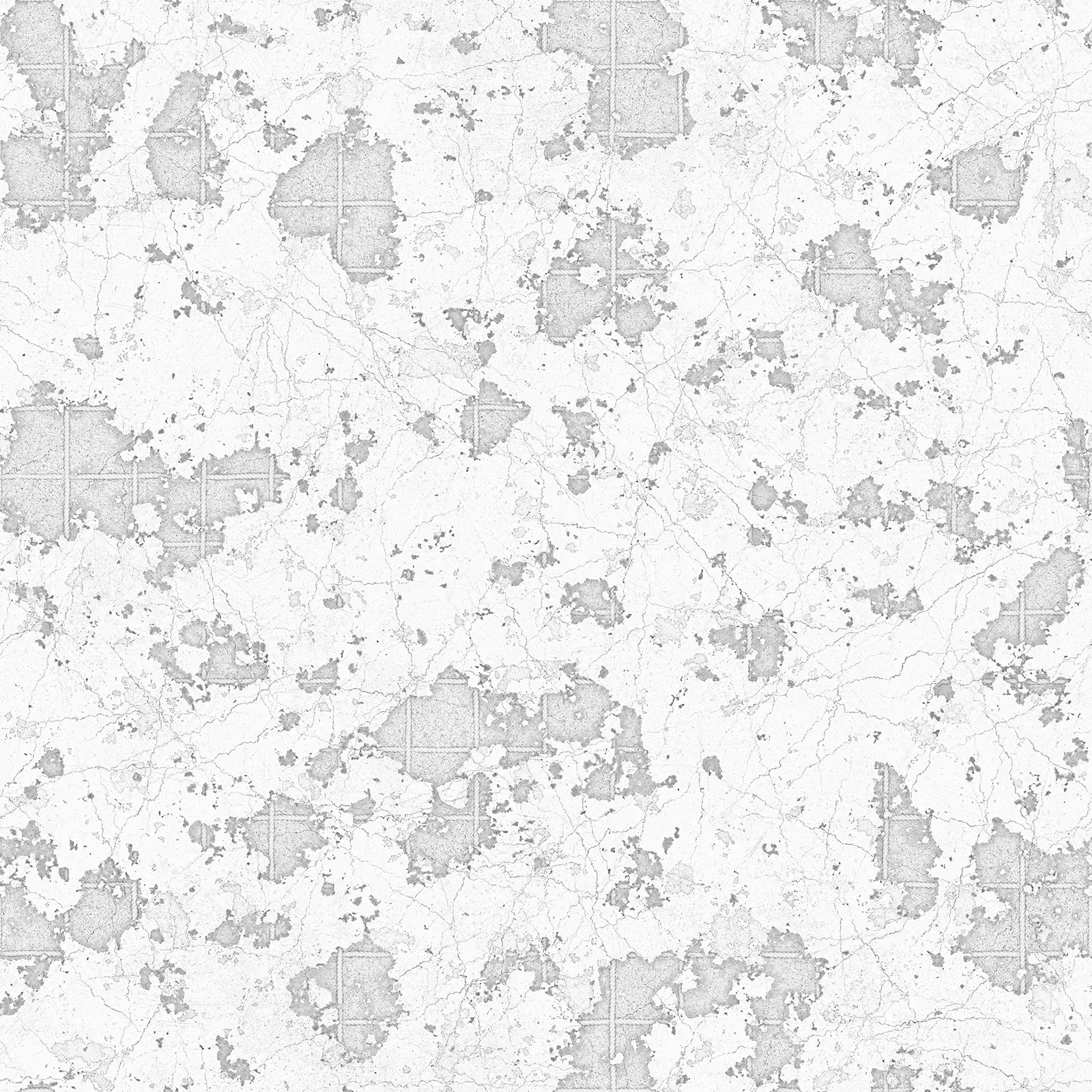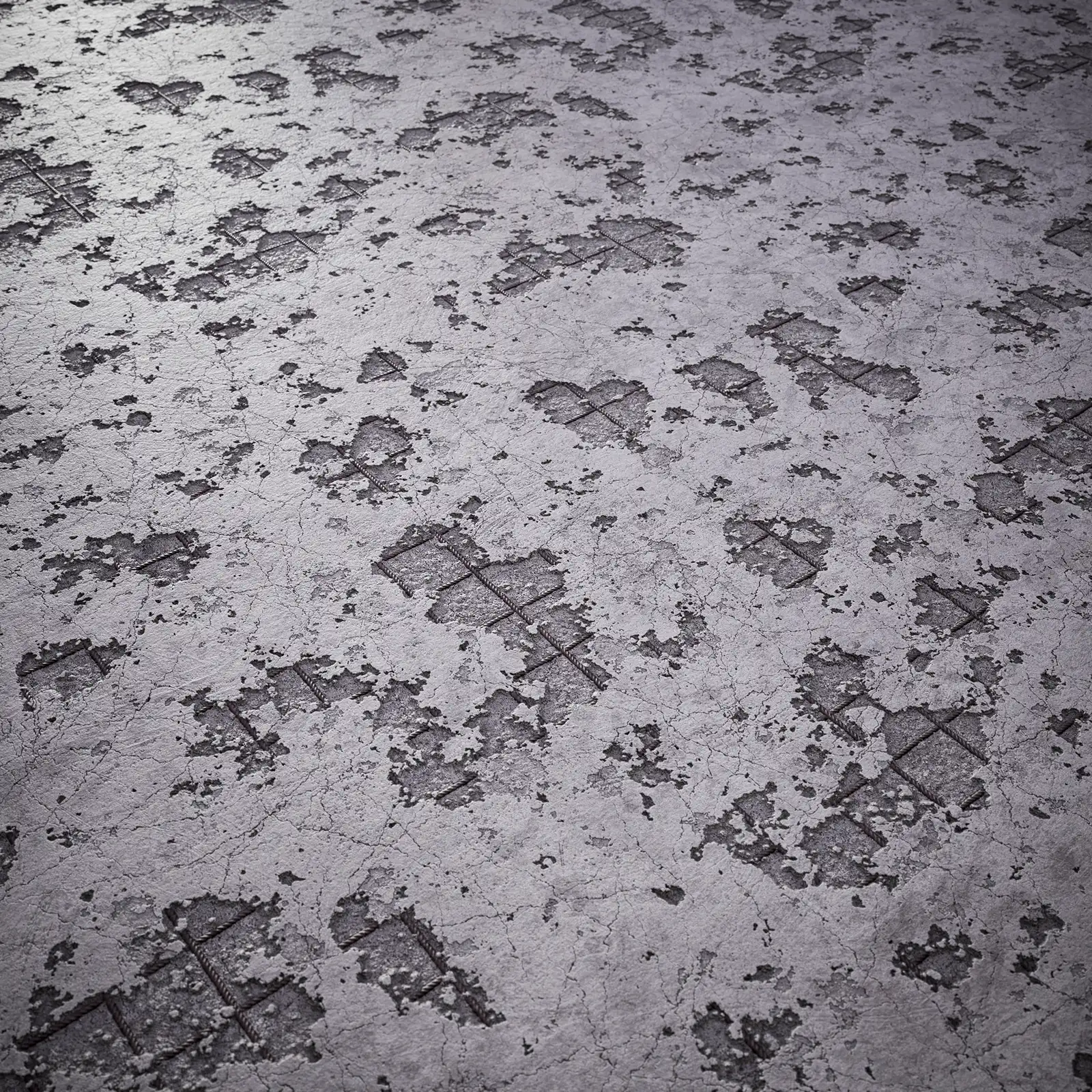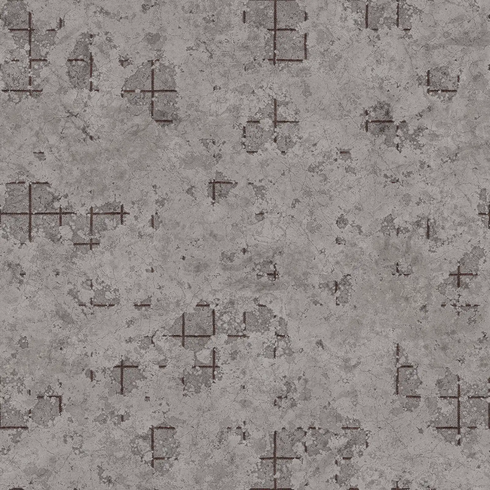Weathered concrete texture featuring extensive surface damage, cracks, and discoloration in grey and brown tones with rough, deteriorated finish. Suitable for architectural visualization, industrial environments, post-apocalyptic scenes, abandoned buildings, and construction material rendering.