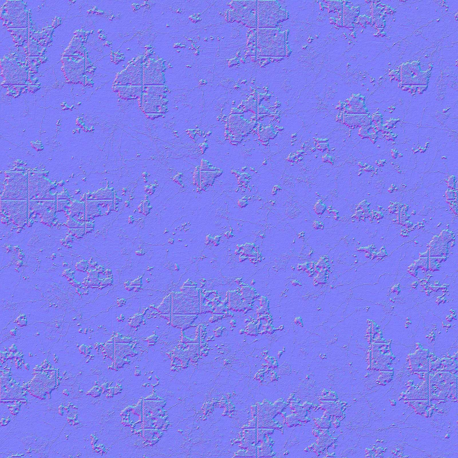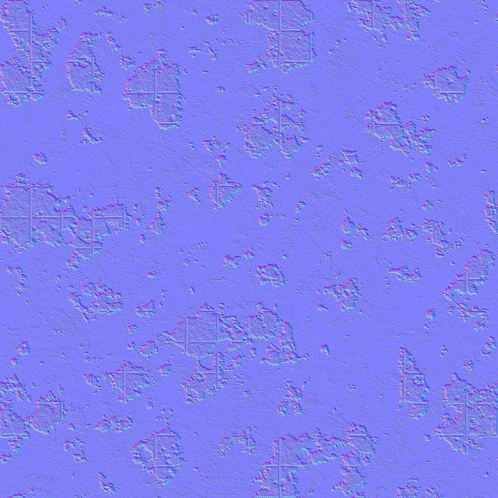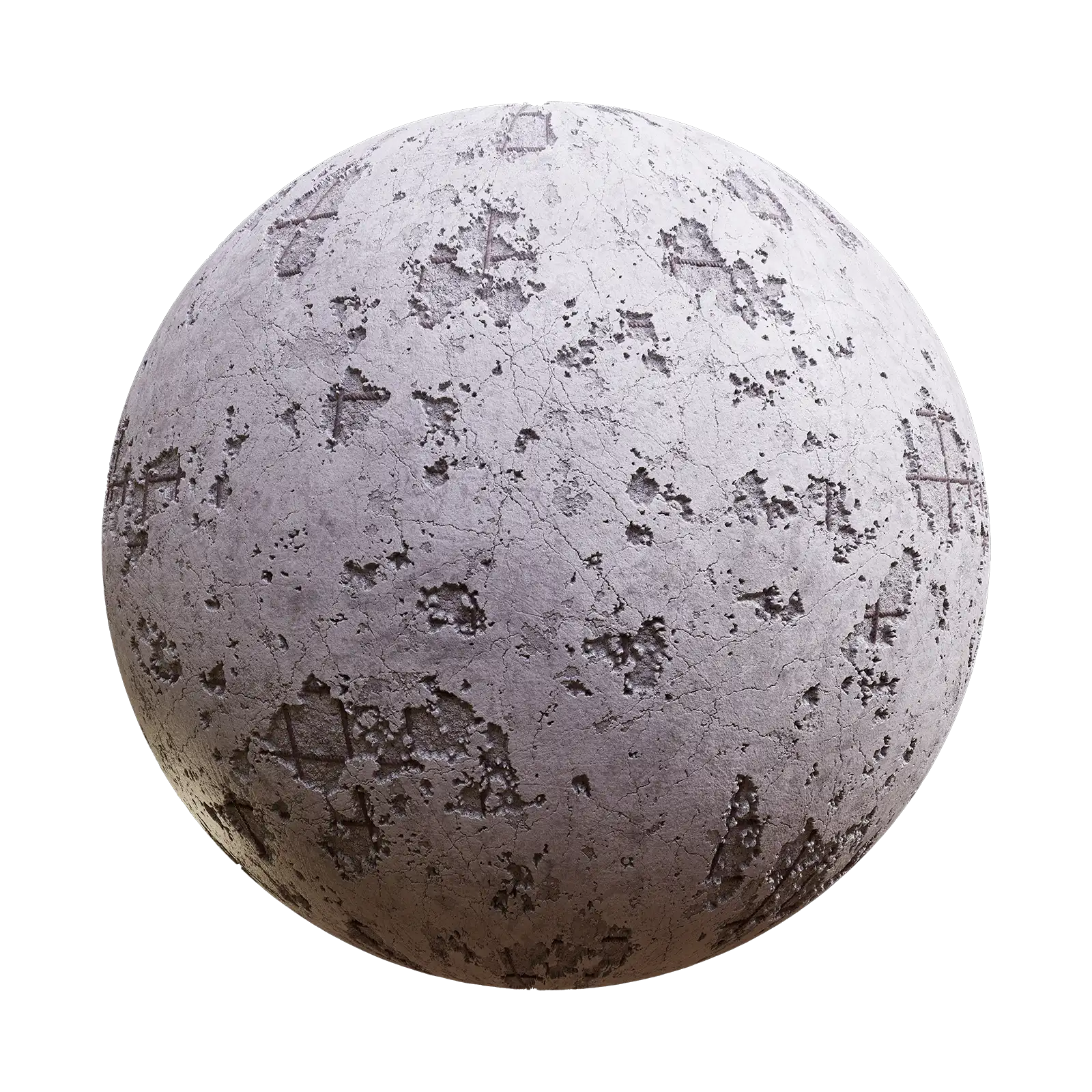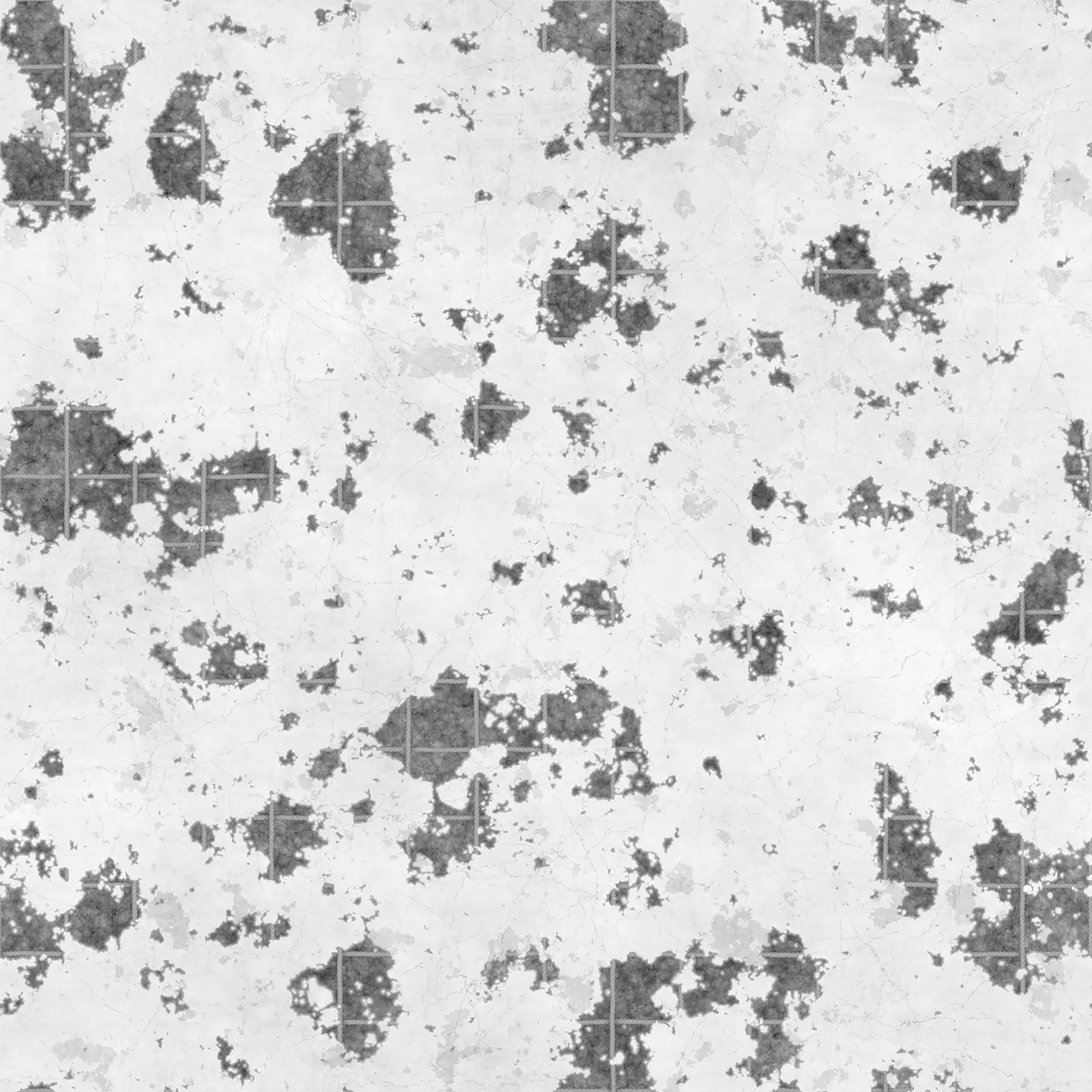 Weathered concrete texture featuring extensive surface damage, cracks, and discoloration in grey and brown tones with rough, deteriorated finish. Suitable for architectural visualization, industrial environments, post-apocalyptic scenes, abandoned buildings, and construction material rendering.