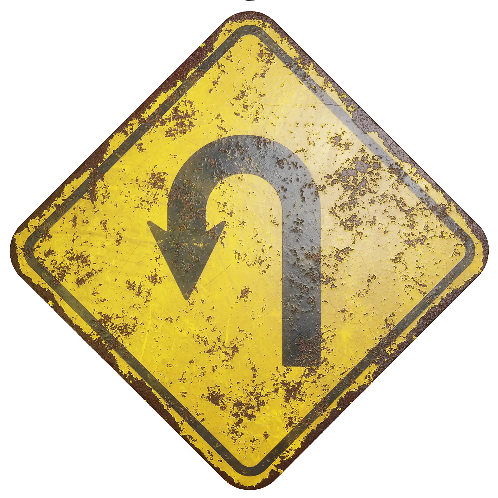 Damaged U Turn Sign with maps: basecolor/diffuse, glossiness, height (TIFF), IOR, metallic, normal (DirectX), normal (OpenGL), reflection, roughness and specular. Resolution: 8192x8192px and 4096x4096px.