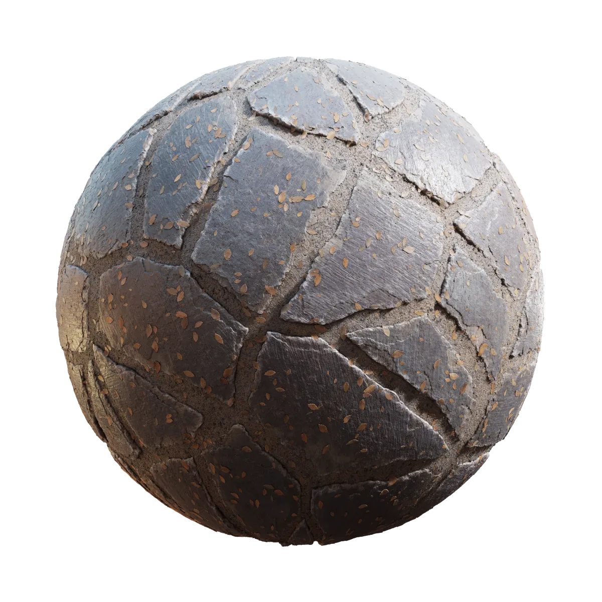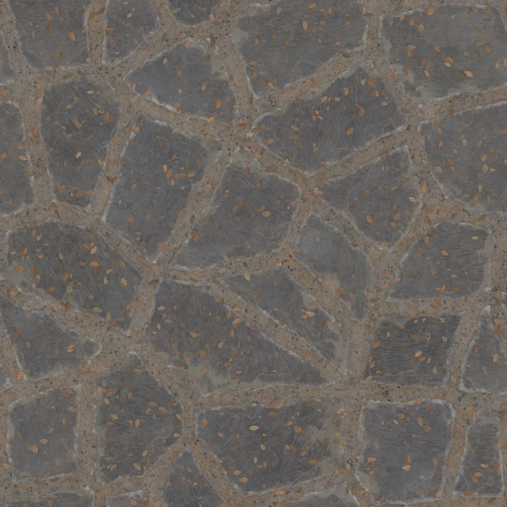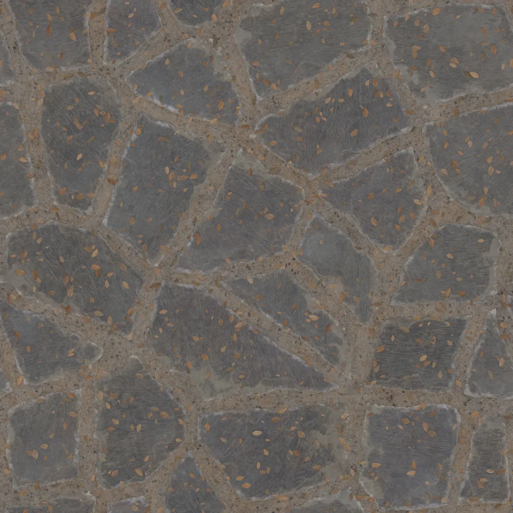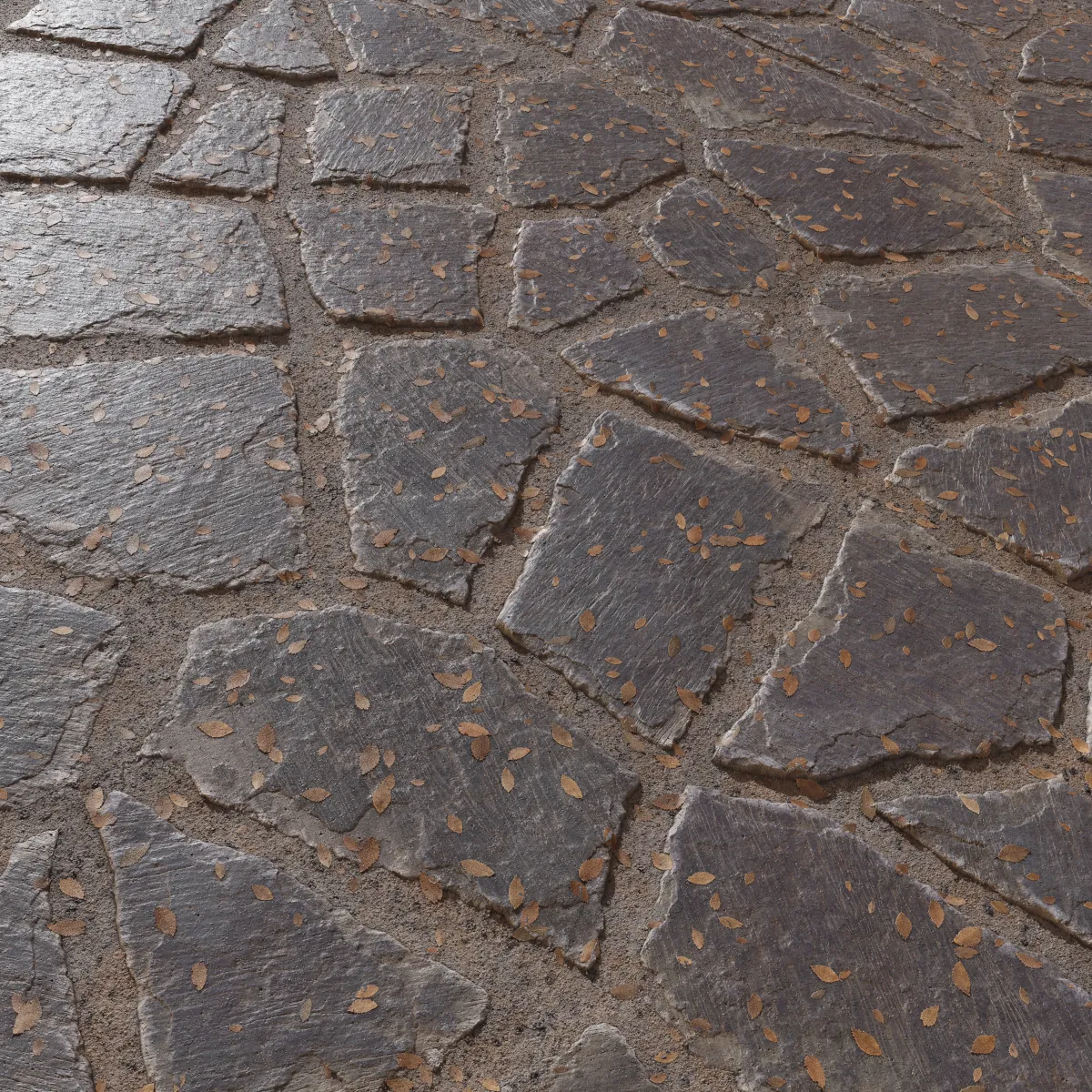 Flagstone with Dry Leaves PBR Texture with maps: basecolor/diffuse, glossiness, height (TIFF), IOR, metallic, normal (DirectX), normal (OpenGL), reflection, roughness and specular. Resolution: 8192x8192px and 4096x4096px.