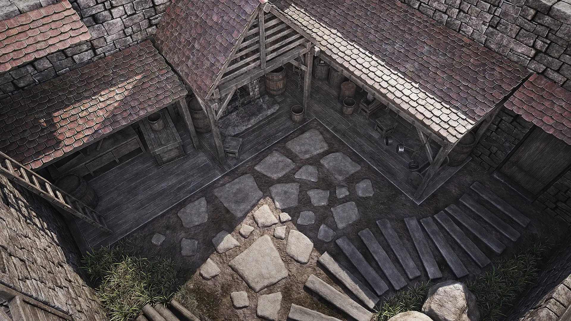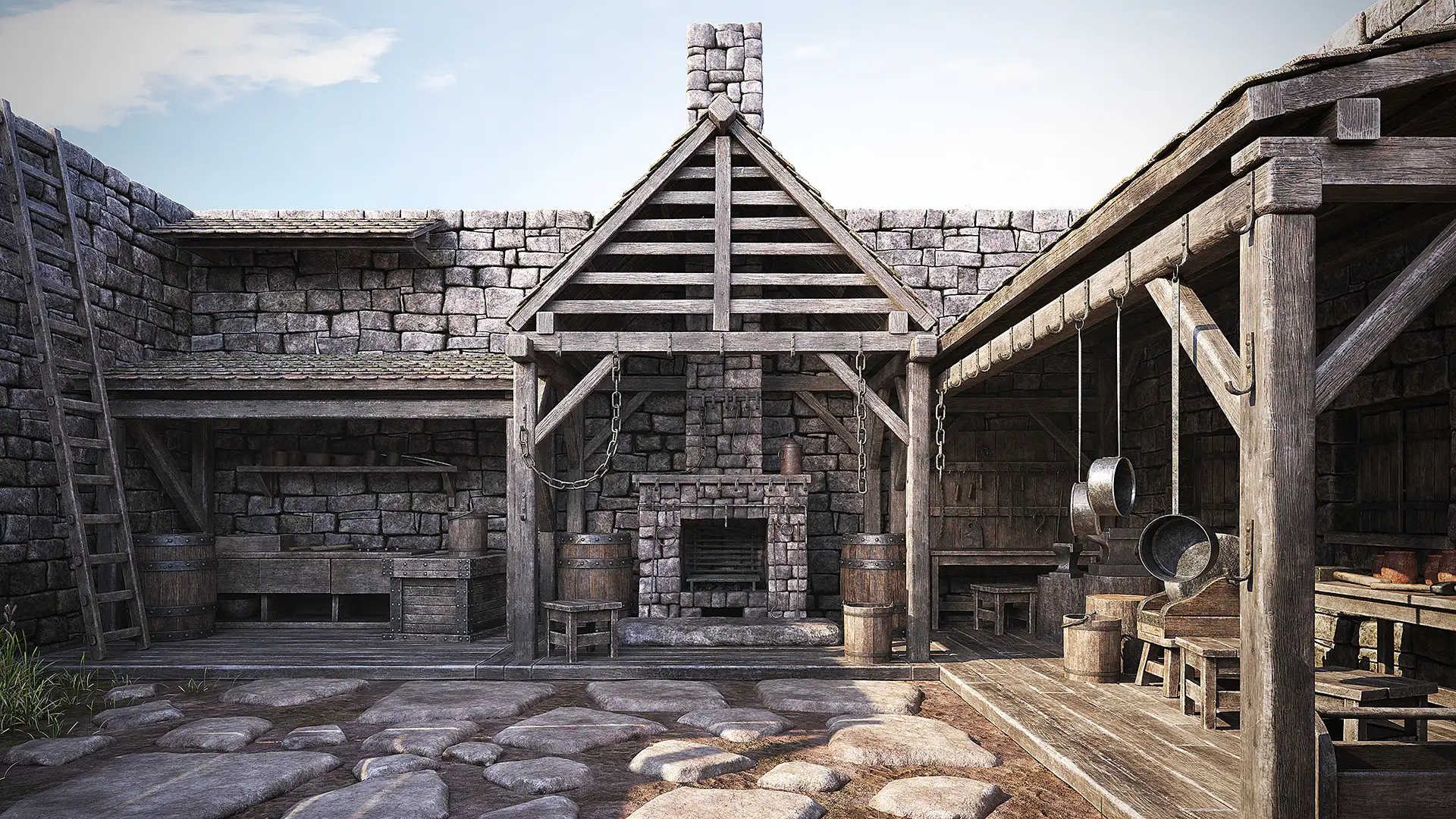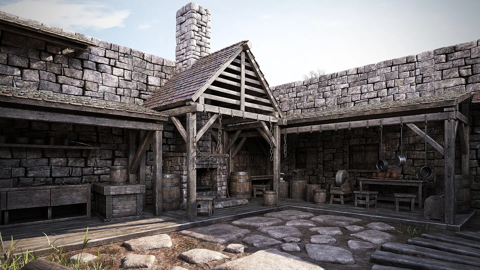 Medieval forge 3d scene. Surrounded by four stone brick walls with a gate and a door. It includes wooden roofs with ceramic tiles along with the furnace and lots of equipment and furniture.
