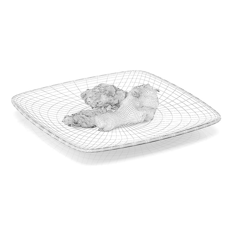 3d model of fried chicken pieces: leg, wing and breast. 3d scanned from real product. Placed on square white plate.