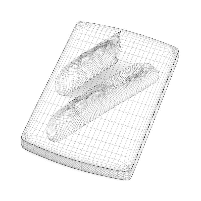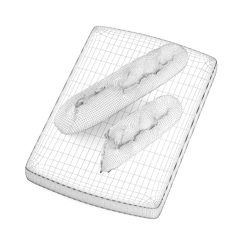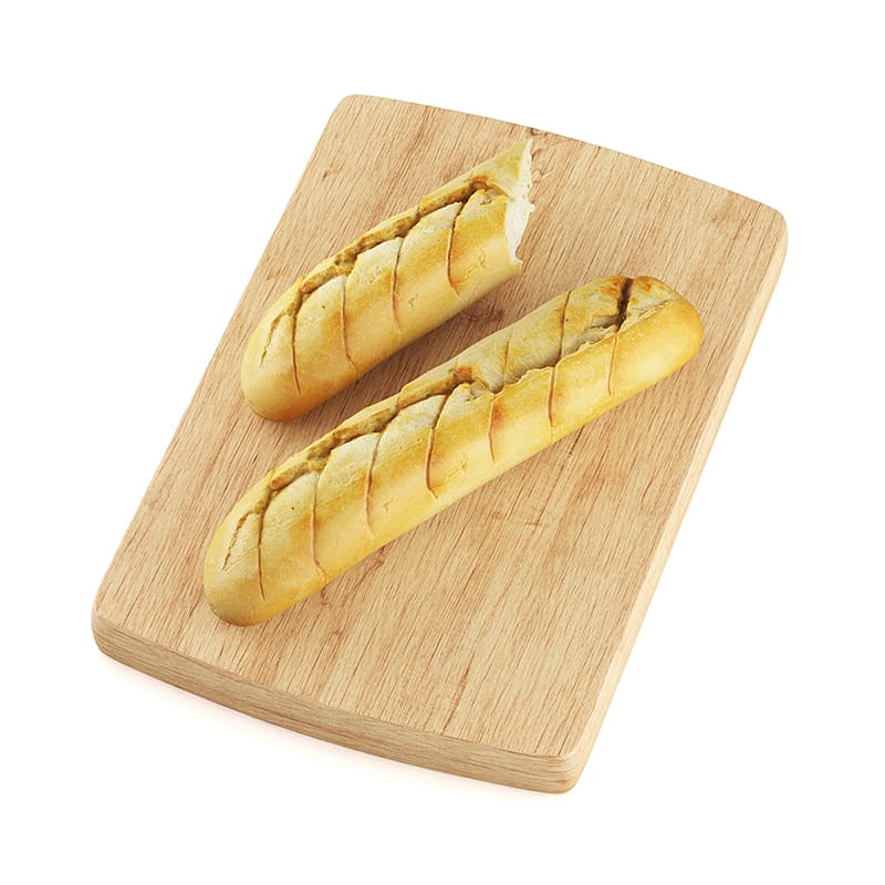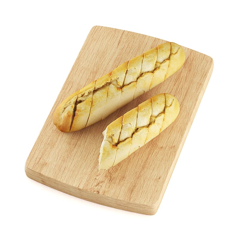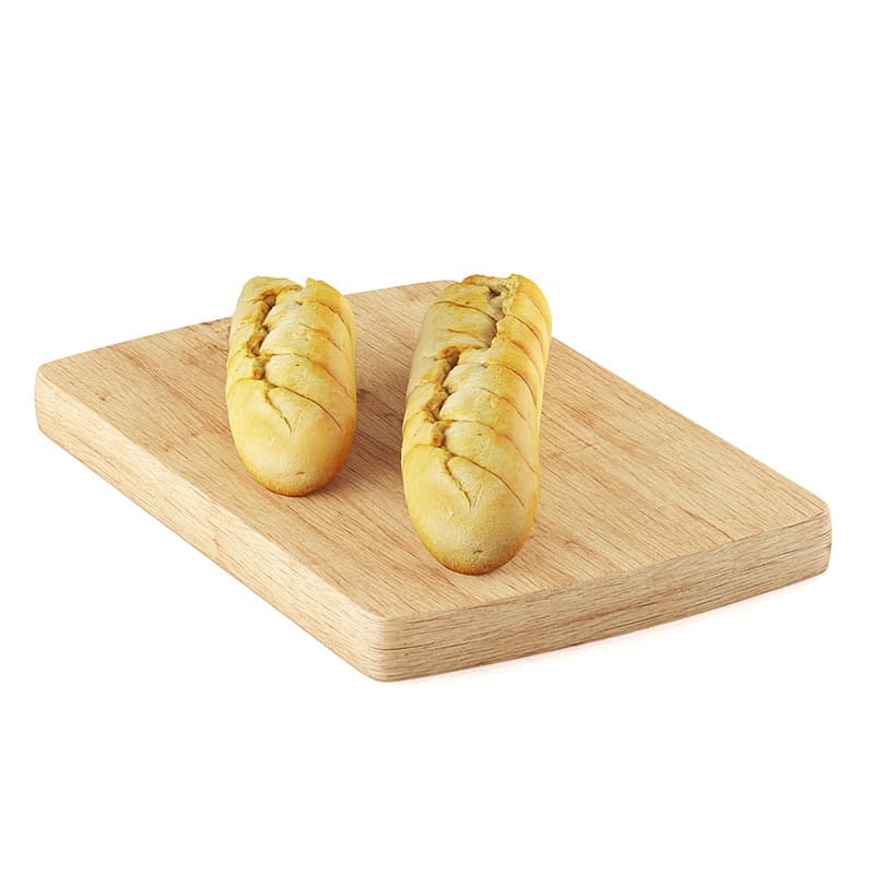3d model of one whole and one half of garlic brad. 3d scanned from real product. Placed on wooden cutting board.