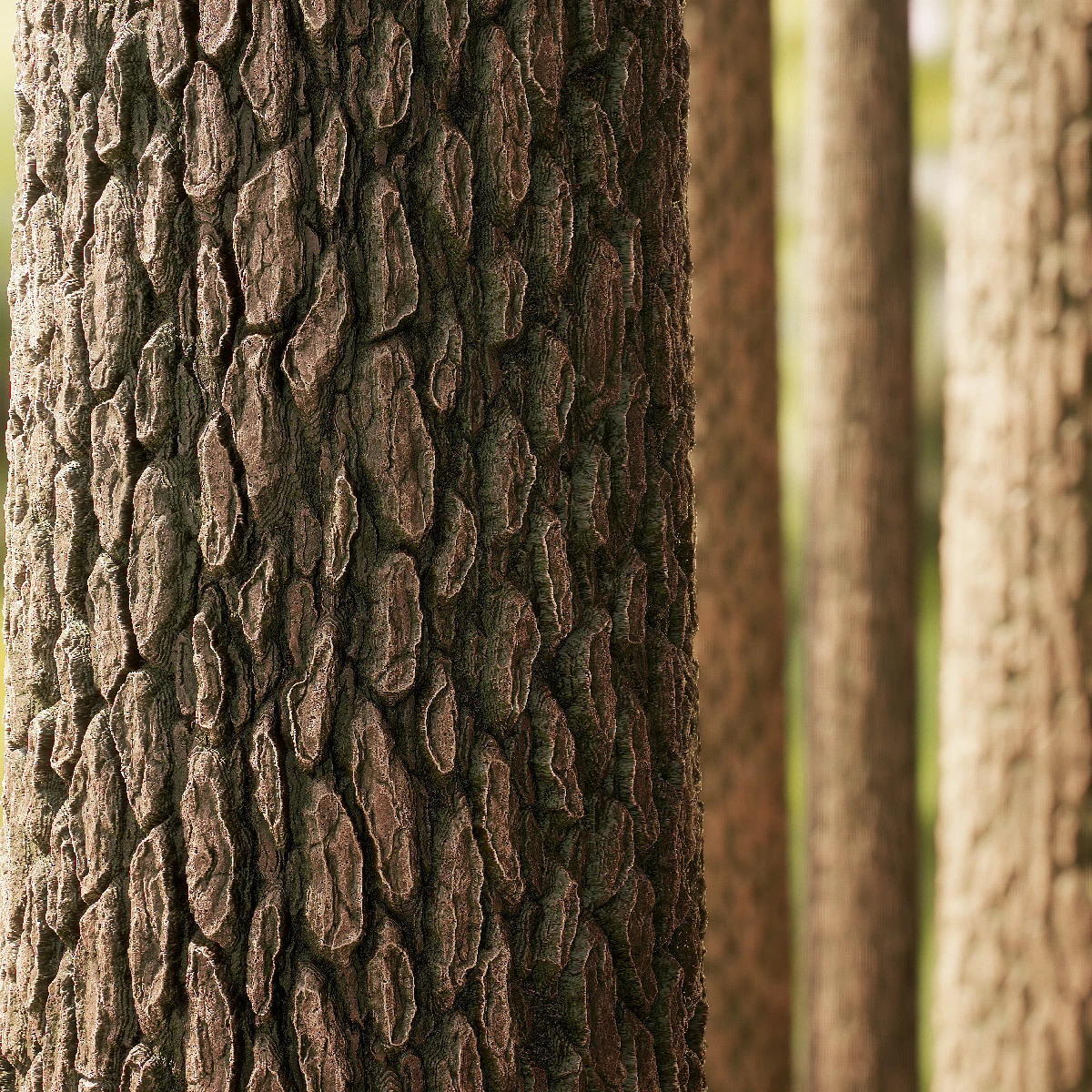 Mossy Pine Tree Bark PBR Texture with maps: basecolor/diffuse, glossiness, height (TIFF), IOR, metallic, normal (DirectX), normal (OpenGL), reflection, roughness and specular. Resolution: 8192x8192px and 4096x4096px.