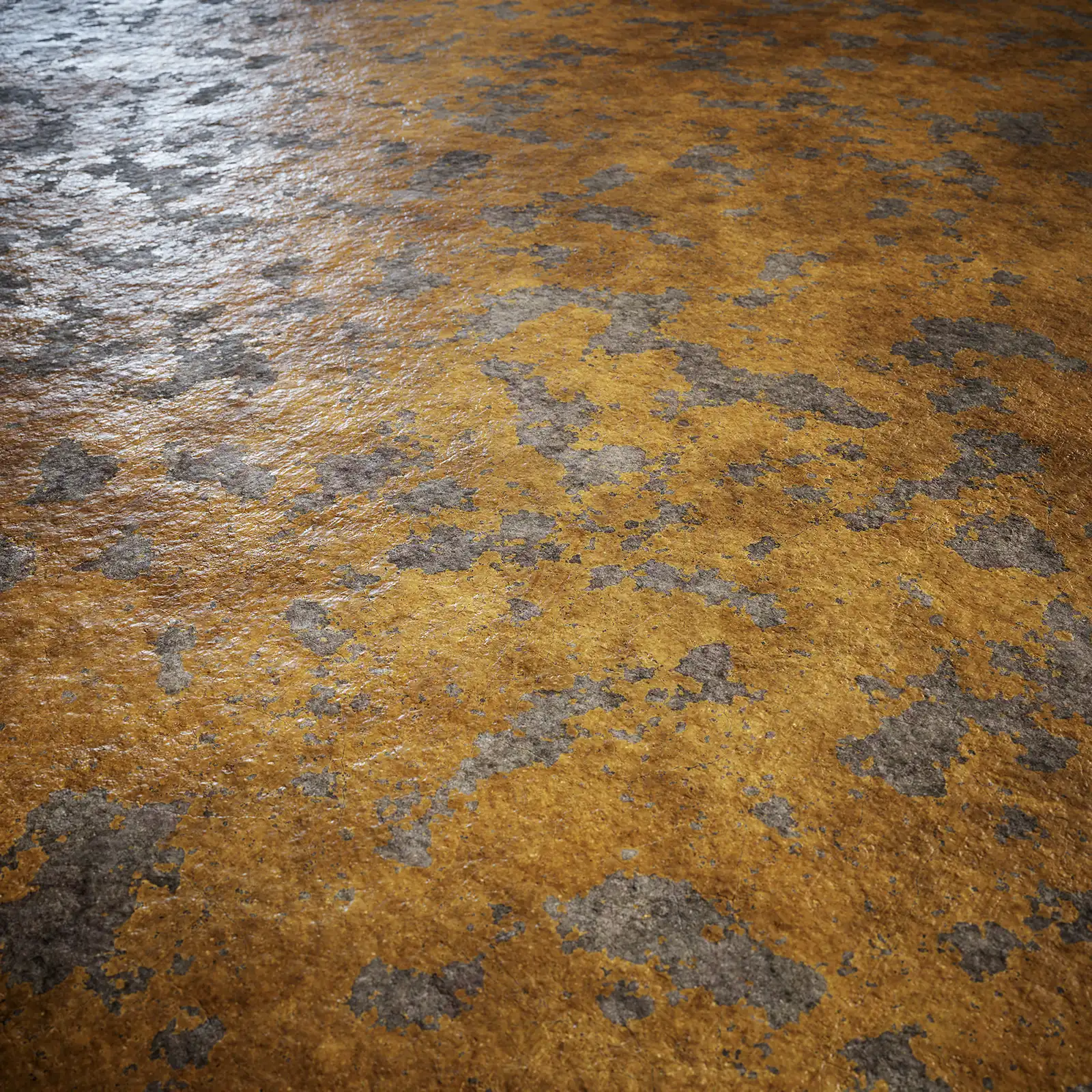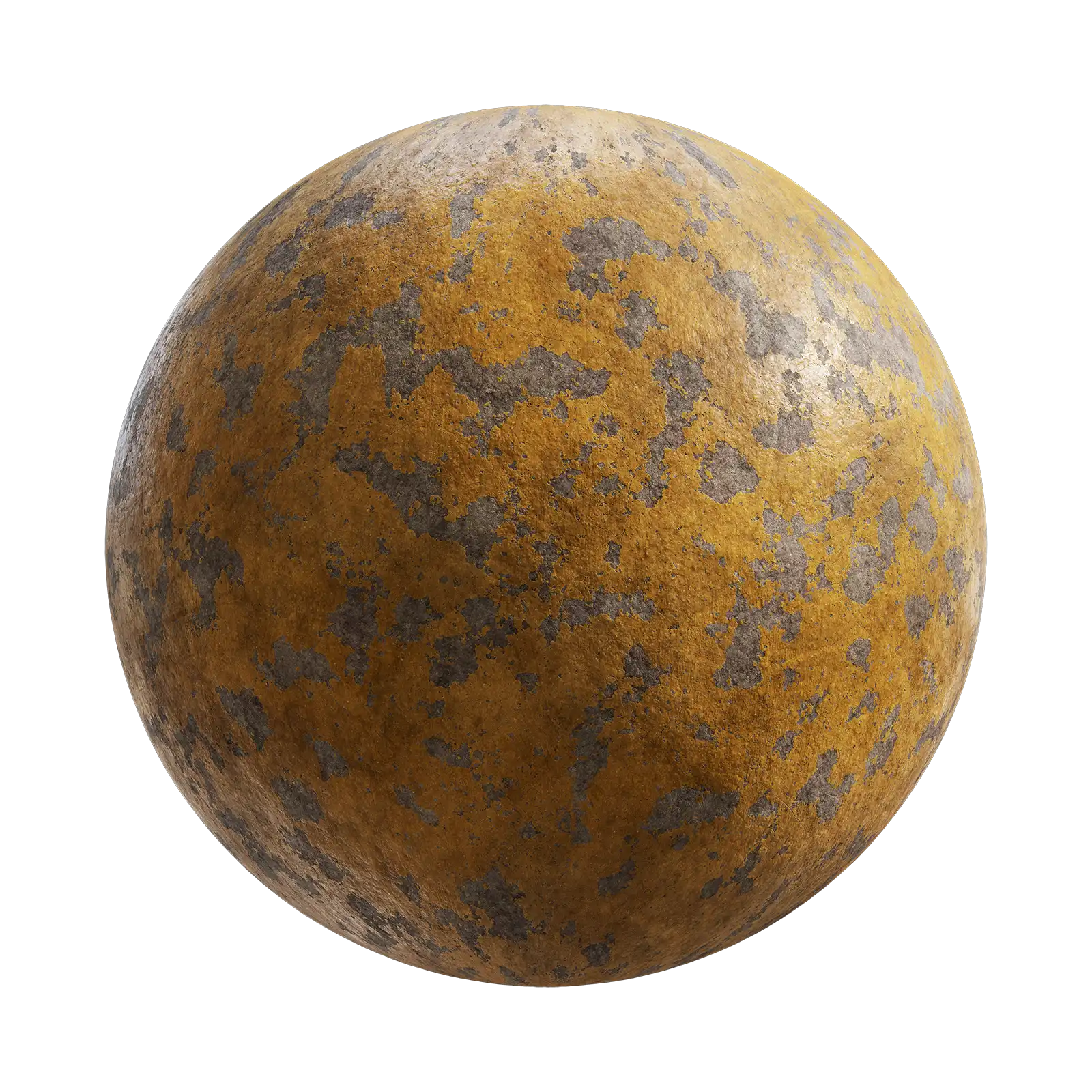 This PBR texture shows an orange painted metal surface with extensive peeling and corrosion patterns. The paint has deteriorated significantly, revealing underlying rust and metal patches throughout. Perfect for industrial environments, abandoned buildings, and weathered architectural elements in 3D scenes.