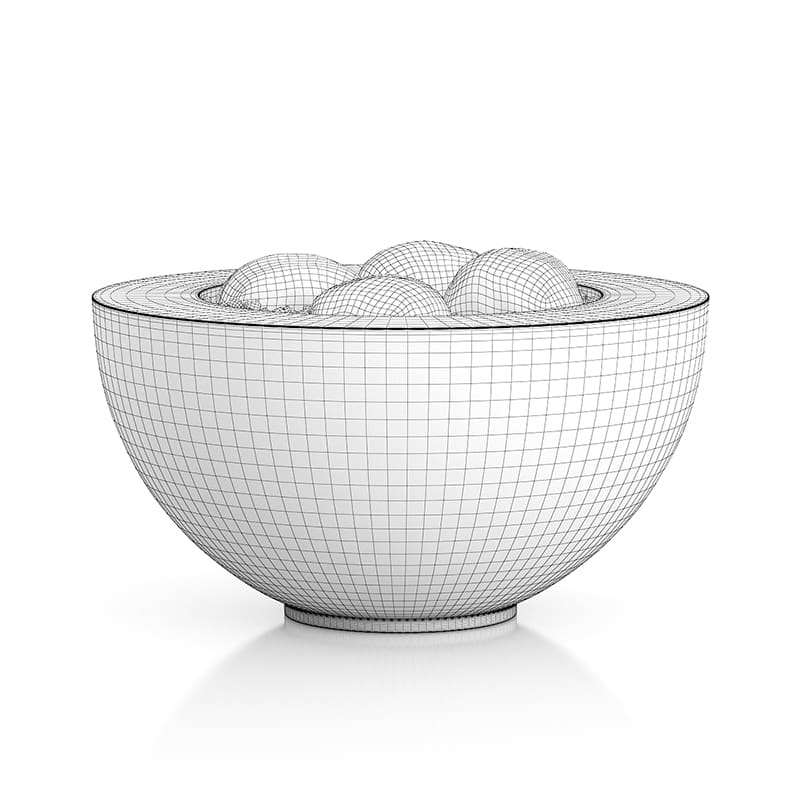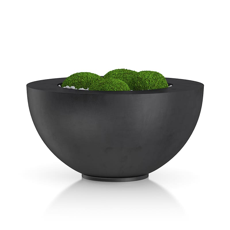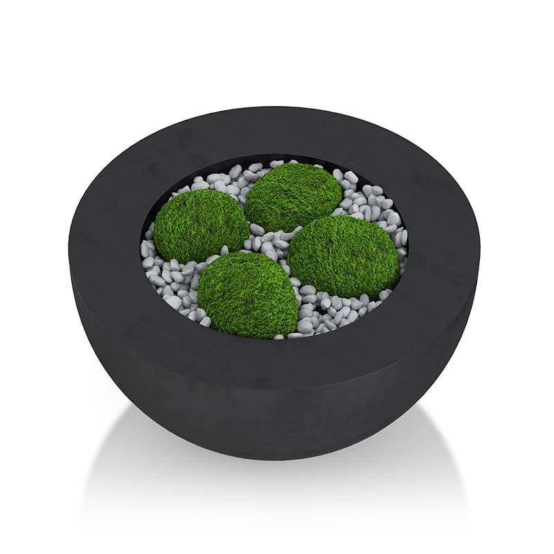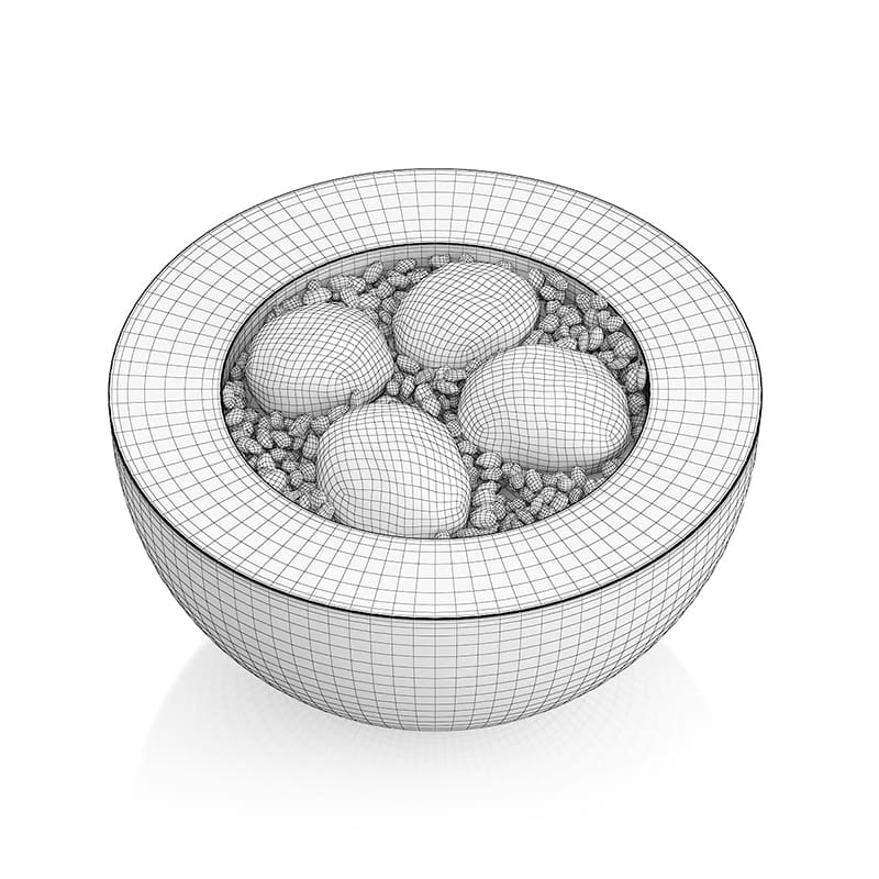 3d model of black moss pot with small white stones inside.