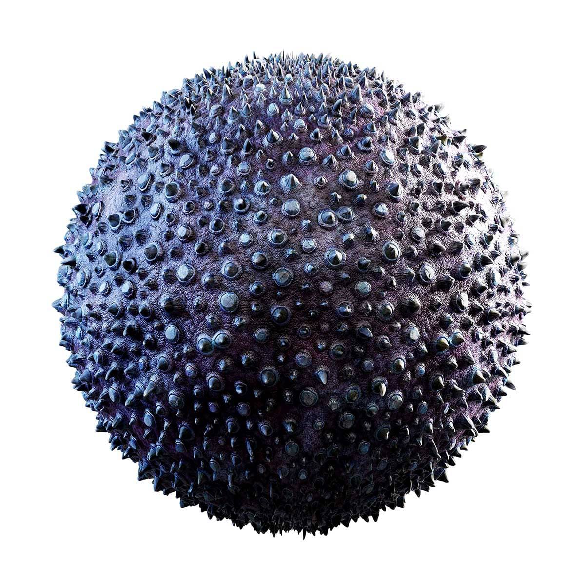 Seamless (tileable) Purple Creature Skin with Spikes PBR Texture with eight maps: albedo/diffuse, reflection, glossiness, height/displacement, roughness, metalness, ambient occlusion and normal map. Resolution: 8192x8192px and 4096x4096px.