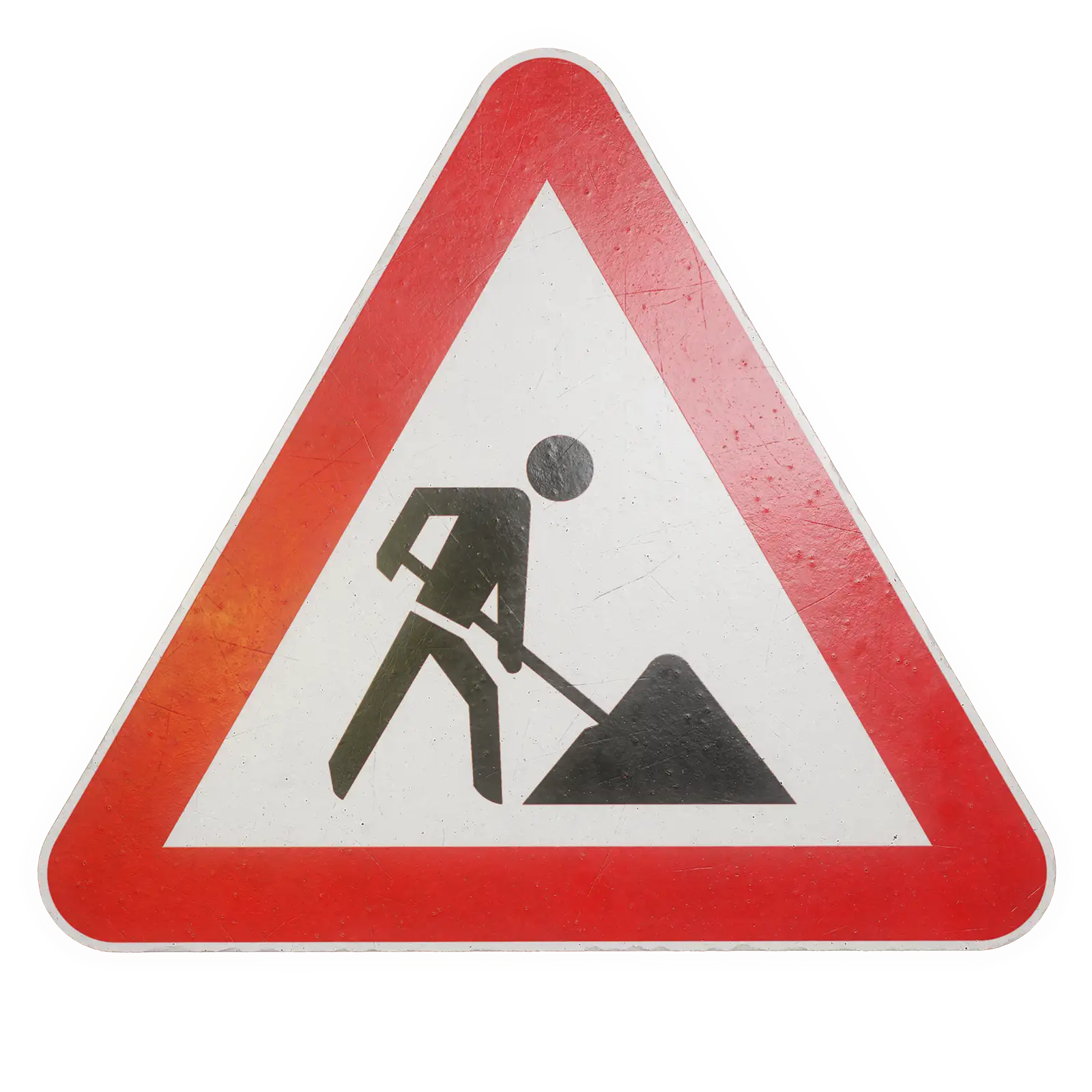 Road Work Sign with maps: basecolor/diffuse, glossiness, height (TIFF), IOR, metallic, normal (DirectX), normal (OpenGL), reflection, roughness and specular. Resolution: 8192x8192px and 4096x4096px.