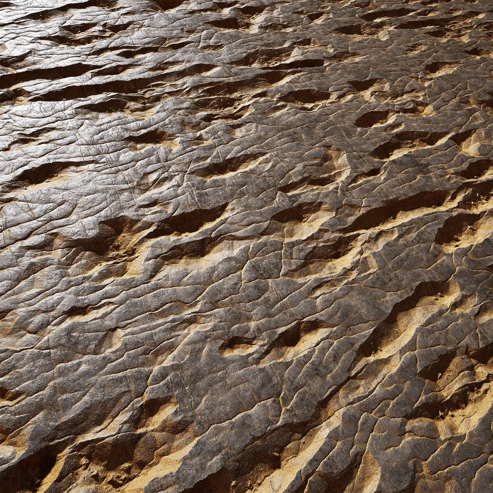 Sandy Damaged Rock with maps: basecolor/diffuse, glossiness, height (TIFF), IOR, metallic, normal (DirectX), normal (OpenGL), reflection, roughness and specular. Resolution: 8192x8192px and 4096x4096px.