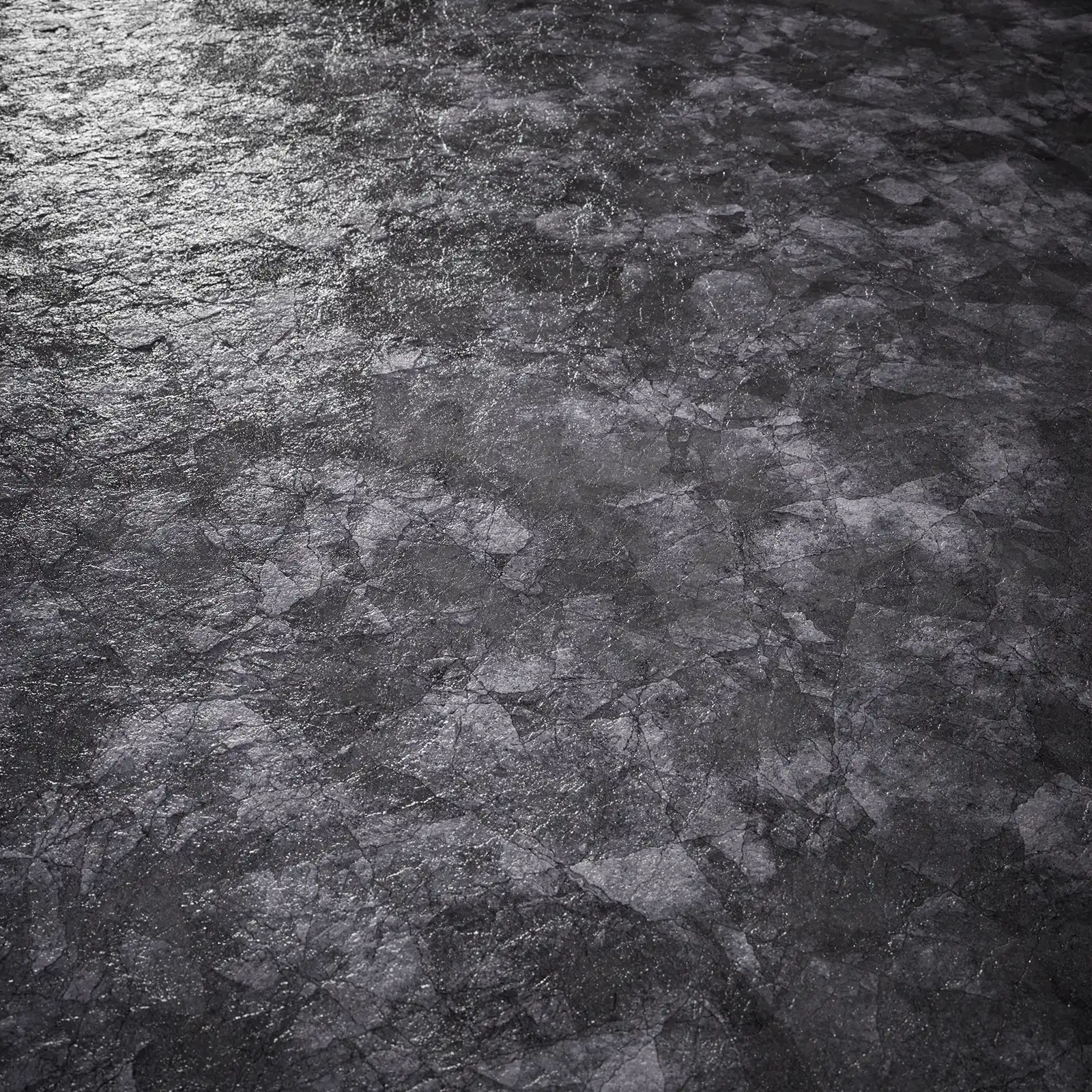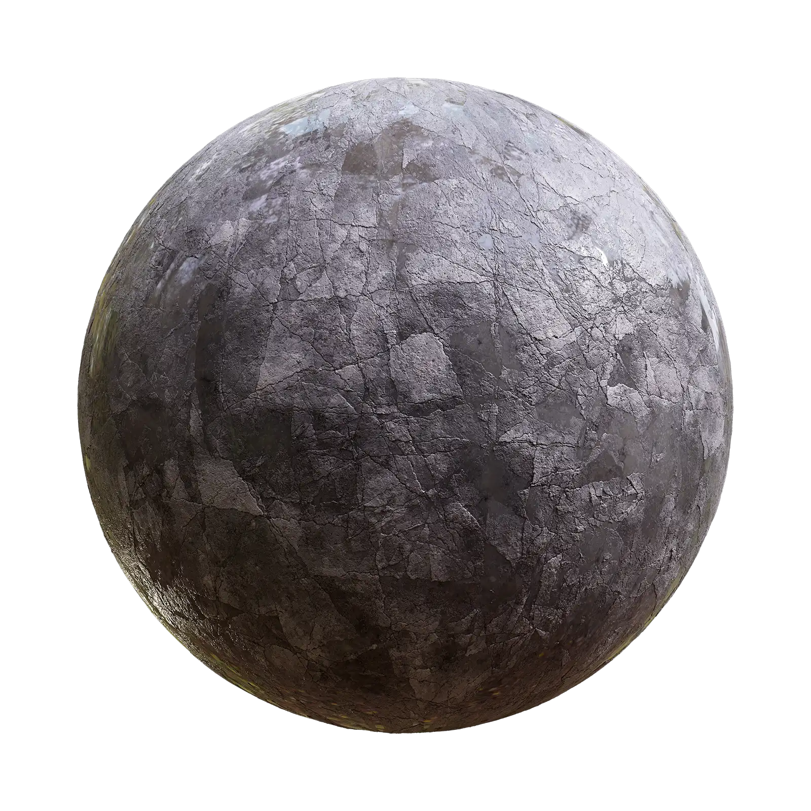 Wet cracked concrete PBR texture featuring a weathered grey surface with visible crack patterns and moisture effects. Suitable for architectural visualization, game environments, urban scenes, pavement surfaces, and construction-related 3D projects.