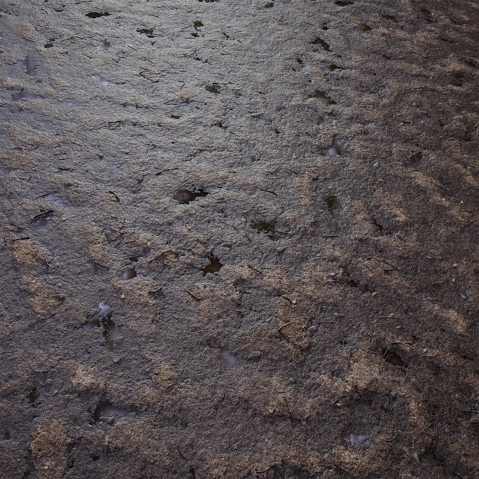 Wet Muddy Ground with maps: basecolor/diffuse, glossiness, height (TIFF), IOR, metallic, normal (DirectX), normal (OpenGL), reflection, roughness and specular. Resolution: 8192x8192px and 4096x4096px.